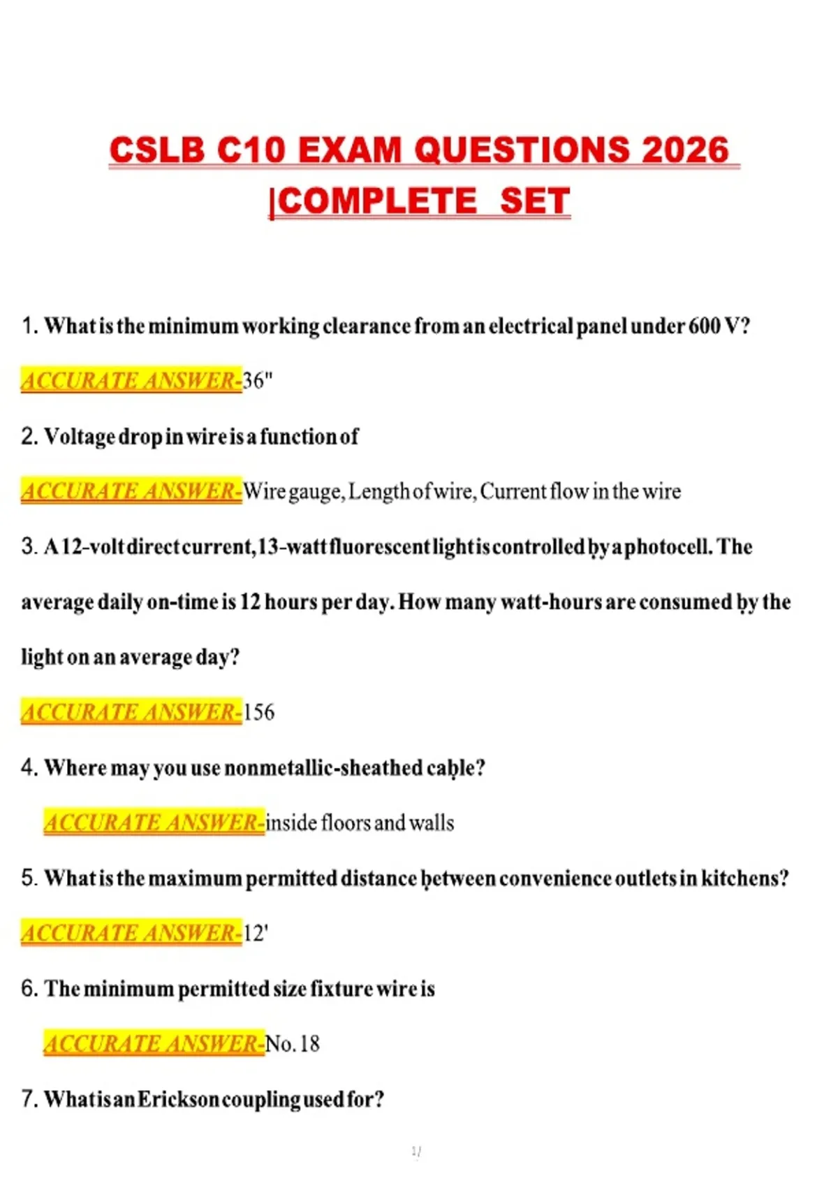 complete and updated set of exam questions and correct answers for the California CSLB C-10 Electrical Contractor Exam, aligned with the 2026 testing requirements. It covers all major exam domains including electrical theory, wiring methods, NEC code requirements, safety regulations, blueprint reading, installation practices, and California contractor laws. Designed for thorough exam preparation, this verified set supports confident readiness for C-10 licensure.