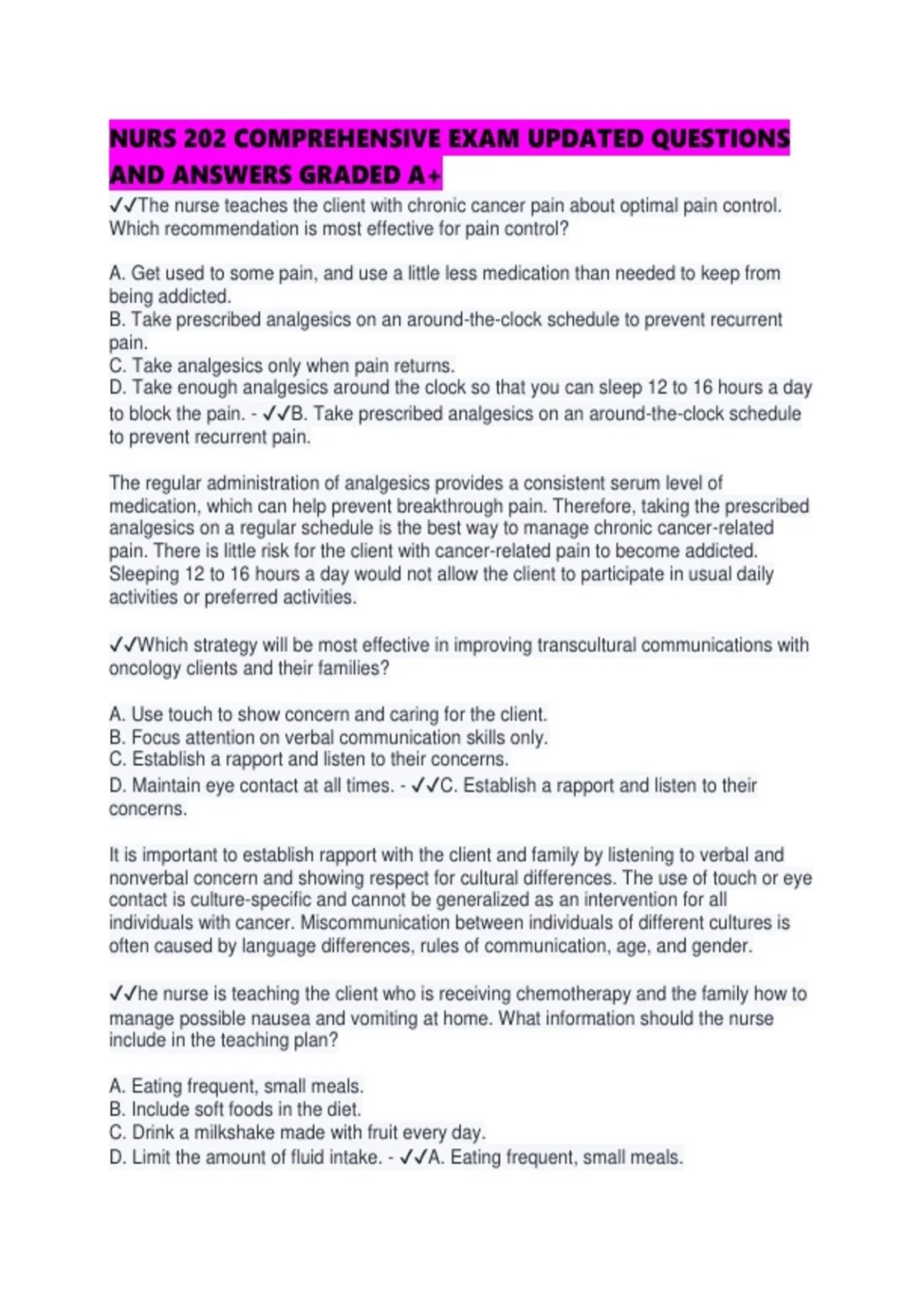 ✔✔The nurse teaches the client with chronic cancer pain about optimal pain control.