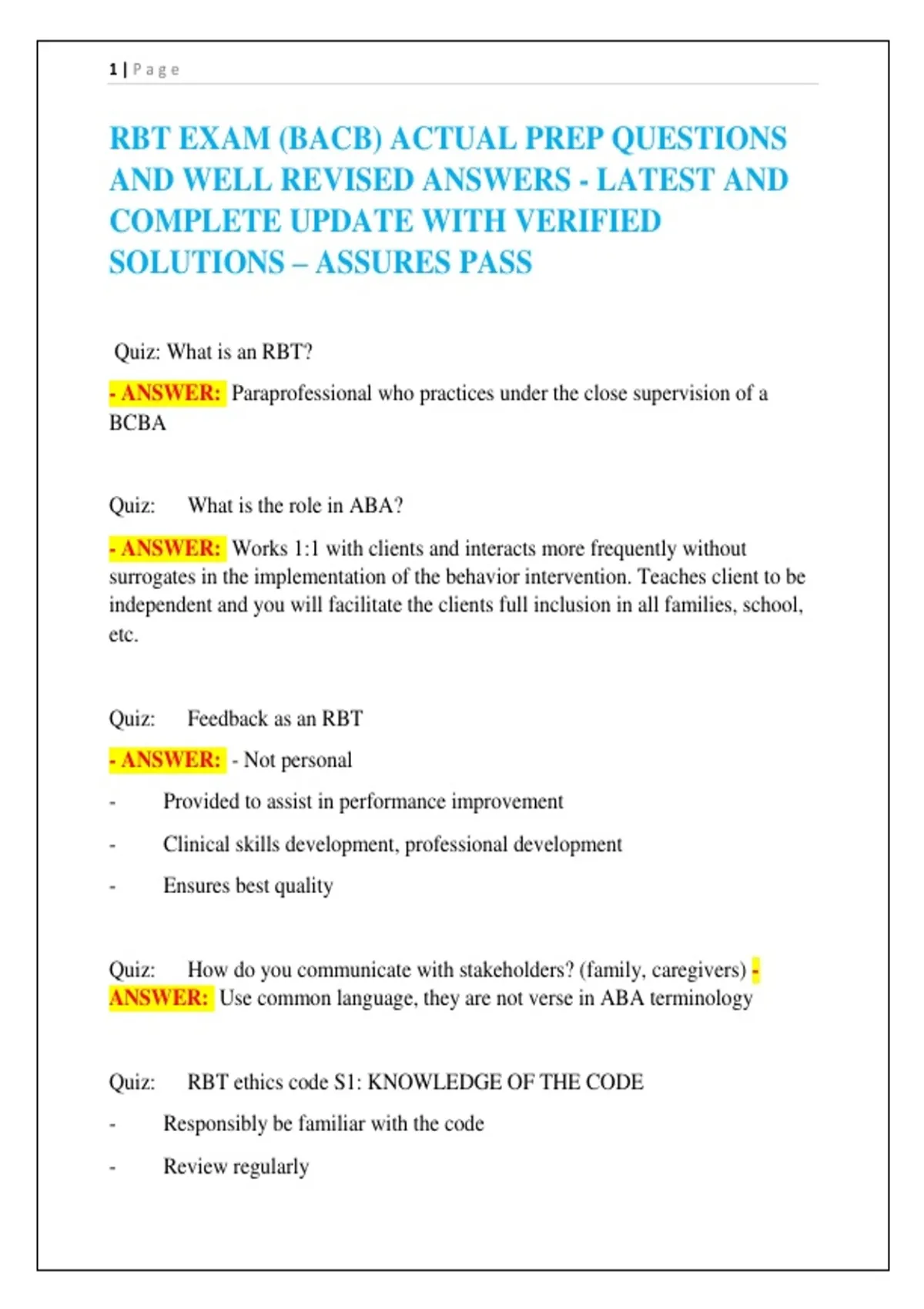 RBT EXAM (BACB) ACTUAL PREP QUESTIONS AND WELL REVISED ANSWERS - LATEST AND COMPLETE UPDATE WITH VERIFIED SOLUTIONS – ASSURES PASS