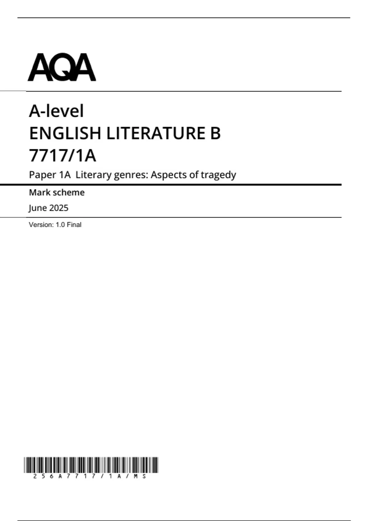 , MARK SCHEME – A-LEVEL ENGLISH LITERATURE B – 7717/1A – JUNE 2025