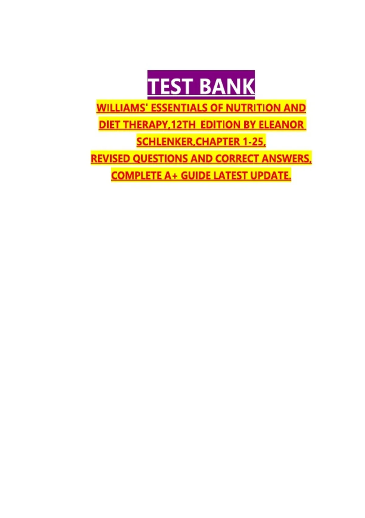 TEST BANK WILLIAMS' ESSENTIALS OF NUTRITION AND DIET THERAPY,12TH EDITION BY ELEANOR SCHLENKER,CHAPTER 1-25, REVISED QUESTIONS AND CORRECT ANSWERS, COMPLETE A+ GUIDE LATEST UPDATE. TEST BANK WILLIAMS' ESSENTIALS OF NUTRITION AND DIET THERAPY,12TH EDITION BY ELEANOR SCHLENKER,CHAPTER 1-25, REVISED QUESTIONS AND CORRECT ANSWERS, COMPLETE A+ GUIDE LATEST UPDATE. TEST BANK WILLIAMS' ESSENTIALS OF NUTRITION AND DIET THERAPY,12TH EDITION BY ELEANOR SCHLENKER,CHAPTER 1-25, REVISED QUESTIONS AND CORRECT ANSWERS, COMPLETE A+ GUIDE LATEST UPDATE.