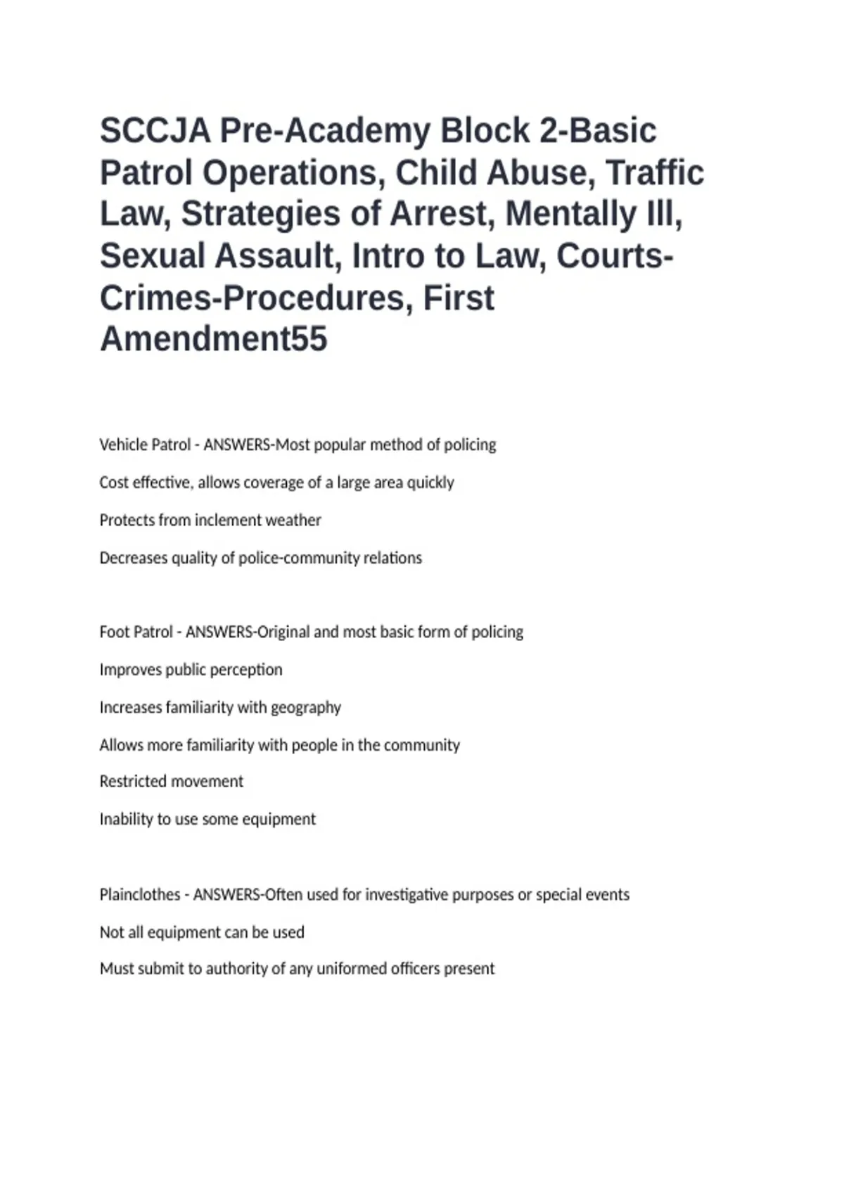 SCCJA Pre-Academy Block 2-Basic Patrol Operations, Child Abuse, Traffic Law, Strategies of Arrest, Mentally Ill, Sexual Assault, Intro to Law, Courts-Crimes-Procedures, First Amendment Vehicle Patrol - ANSWERS-Most popular method of policing Cost effective, allows coverage of a large area quickly Protects from inclement weather Decreases quality of police-community relations Foot Patrol - ANSWERS-Original and most basic form of policing Improves public perception Increases familiarity with geography Allows more familiarity with people in the community Restricted movement Inability to use some equipment Plainclothes - ANSWERS-Often used for investigative purposes or special events Not all equipment can be used Must submit to authority of any uniformed officers present Community Oriented Policing - ANSWERS-A philosophy that combines traditional aspects of law enforcement with prevention measures, problem-solving, community engagement, and community partnerships