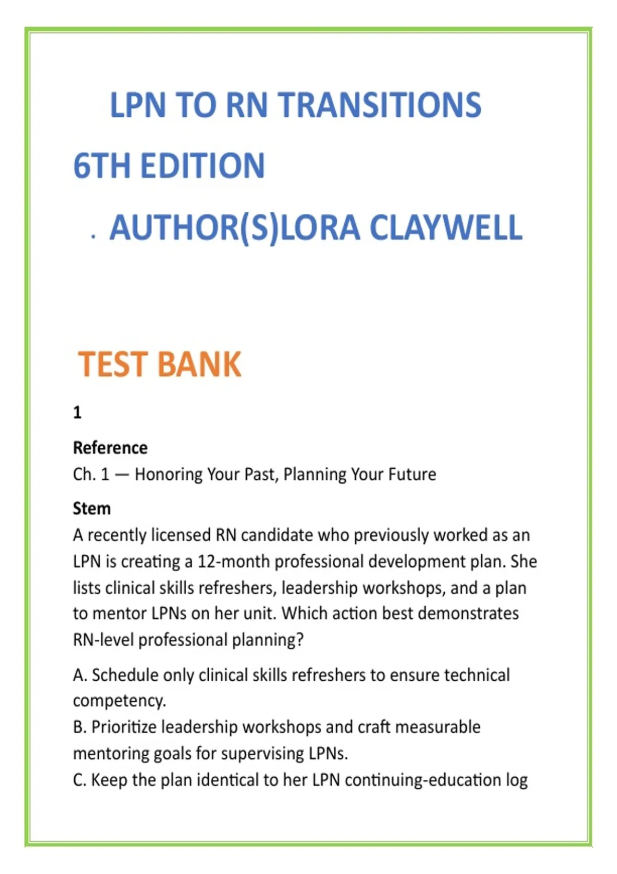 LPN to RN Transitions Test Bank | Claywell 6th Edition | NCLEX-Style MCQs for LPN-RN Bridge & RN Role Development 2) SEO Product Description (200–300 words) Master the transition from Licensed Practical Nurse (LPN) to Registered Nurse (RN) with this comprehensive NCLEX-style test bank designed to accompany Lora Claywell’s LPN to RN Transitions, 6th Edition—one of the most widely adopted textbooks for professional nursing role advancement. This digital LPN to RN Transitions Test Bank provides FULL coverage of every unit and chapter, with 20 high-quality NCLEX-style multiple-choice questions per chapter, written at the RN clinical judgment level. Each question is paired with clear, evidence-based rationales that reinforce safe practice, scope-of-practice expansion, and RN-level accountability. The questions focus on realistic role-transition scenarios encountered by LPN-to-RN students, emphasizing delegation, prioritization, leadership, legal responsibility, and professional identity development. Designed for efficiency and confidence-building, this test bank helps learners think like RNs—not task-oriented practical nurses. What’s Included: Complete textbook coverage (all units & chapters) 20 NCLEX-style MCQs per chapter Detailed rationales explaining correct and incorrect options RN-level clinical judgment scenarios Focus on delegation, prioritization, leadership & accountability Ideal for exam prep, quizzes, remediation, and self-study Ideal For: LPN-to-RN Bridge Program students Practical-to-Professional Nursing Transition courses RN Role Development & Professional Practice classes NCLEX-RN preparation modules Built to save time, reinforce key concepts, and accelerate RN readiness, this test bank is a powerful tool for successful, confident transition into professional nursing practice. 3) 8 High-Value SEO Keywords LPN to RN transitions test bank Claywell LPN to RN study guide LPN RN bridge program MCQs RN role transition nursing questions NCLEX style LPN to RN practice questions Professional nursing transition test bank LPN to RN delegation prioritization questions RN clinical judgment transition exam 4) 10 Optimized Hashtags #LPNtoRN #NursingTransition #LPNRNBridge #RNRoleDevelopment #NursingTestBank #NCLEXStyleQuestions #ProfessionalNursing #NursingEducationResources #RNClinicalJudgment #ClaywellNursing