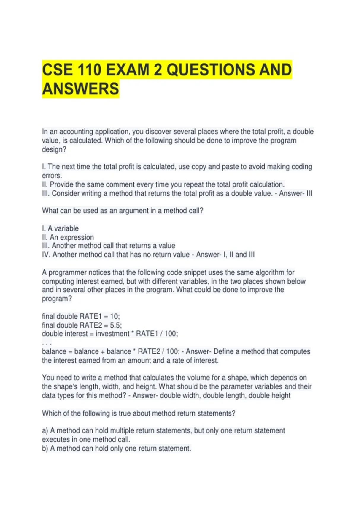 CSE 110 EXAM 2 QUESTIONS AND ANSWERS