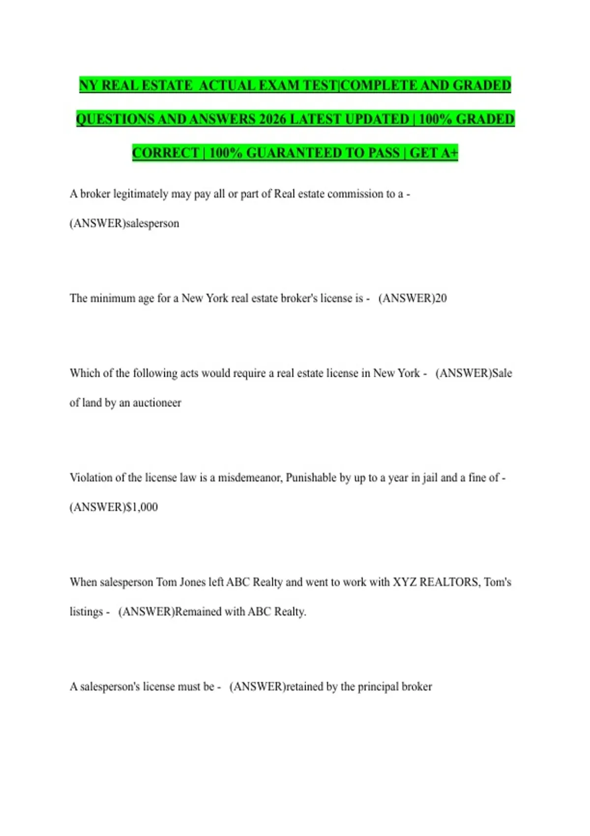 NY REAL ESTATE ACTUAL EXAM TEST|COMPLETE AND GRADED QUESTIONS AND ANSWERS 2026 LATEST UPDATED | 100% GRADED CORRECT | 100% GUARANTEED TO PASS | GET A+