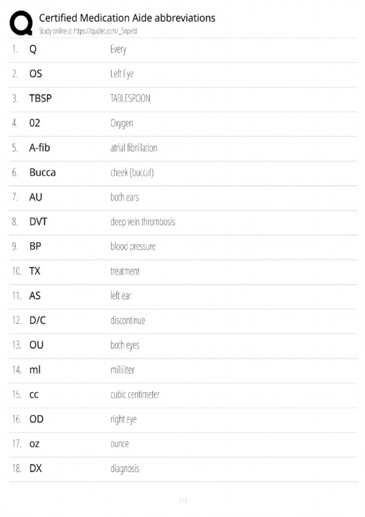 Certified Medication Aide Abbreviations / CMA Master List / Study Guide / 2025 Update / Score 100%