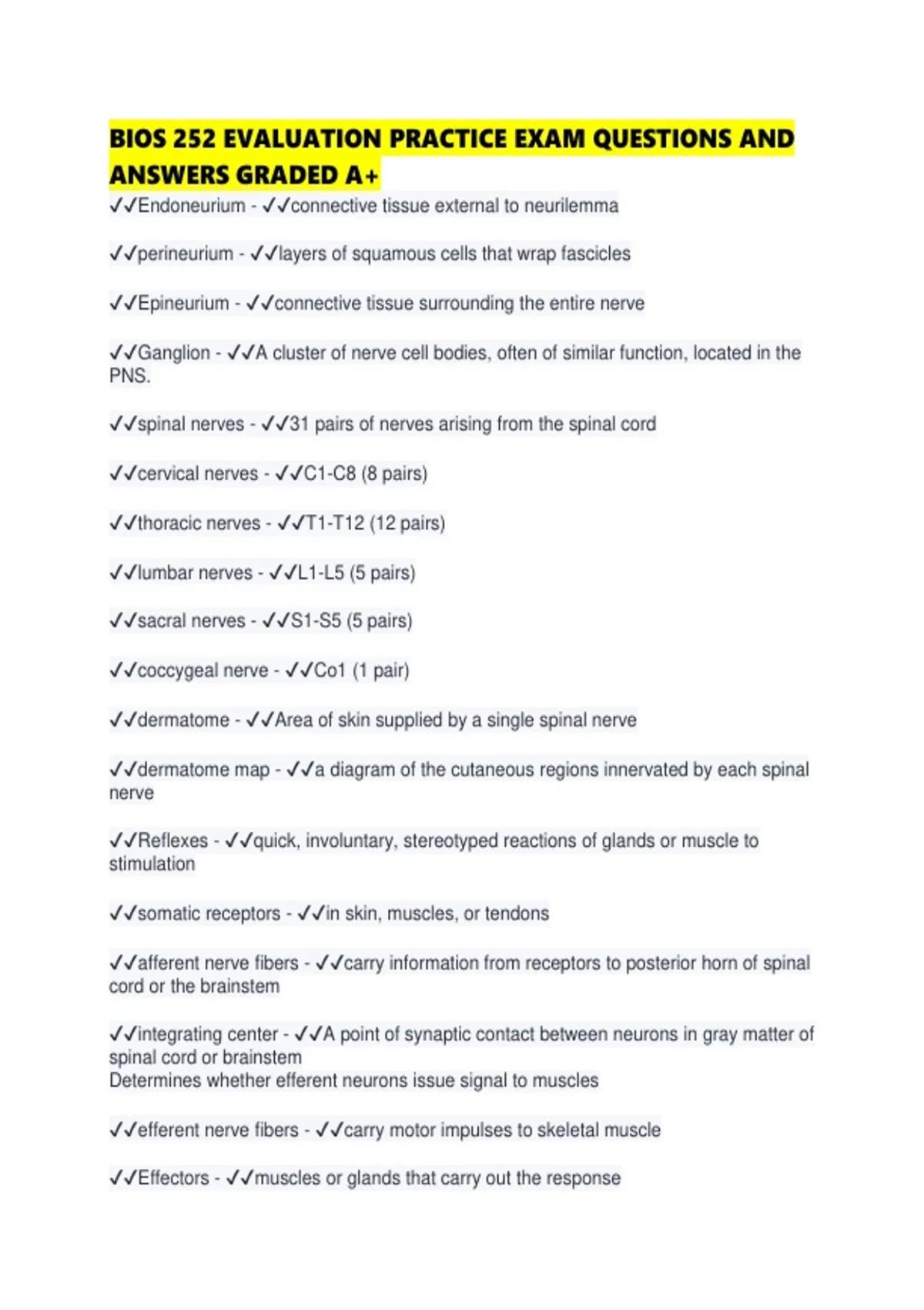 BIOS 252 EVALUATION PRACTICE EXAM QUESTIONS AND ANSWERS GRADED A+