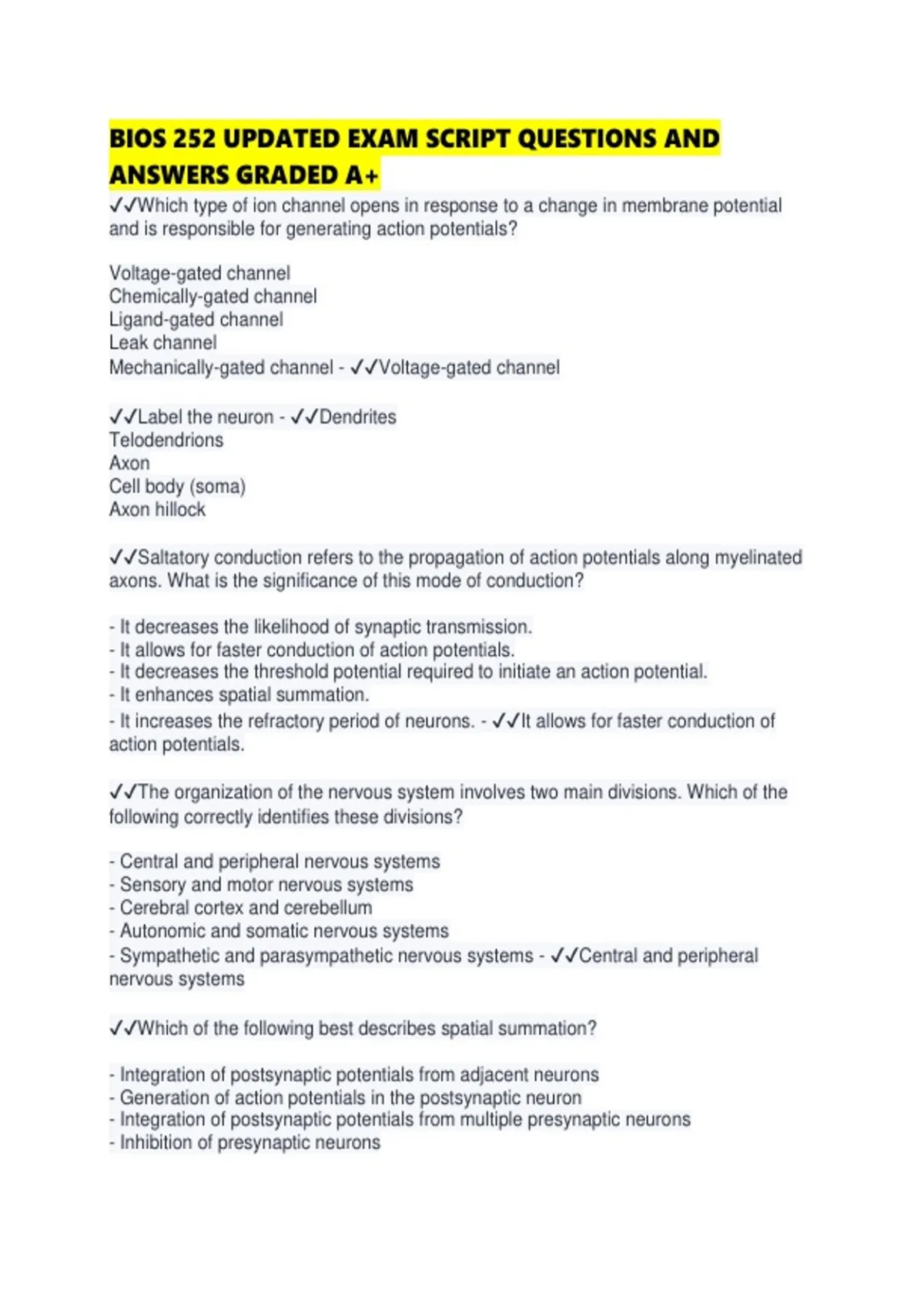 BIOS 252 UPDATED EXAM SCRIPT QUESTIONS AND ANSWERS GRADED A+