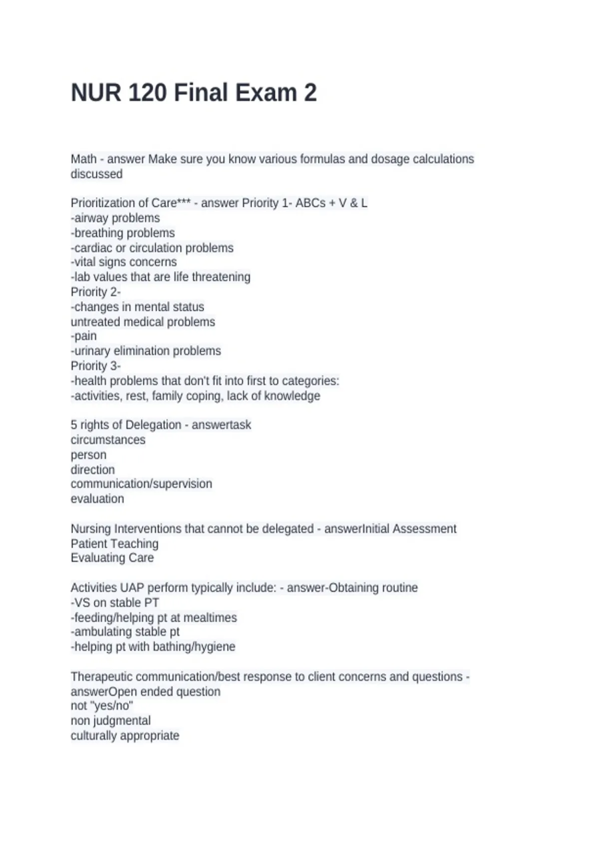 NUR 120 Final Exam 2 Questions and Answers