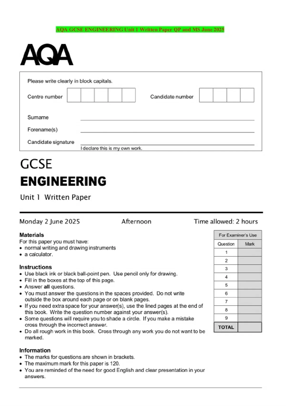 AQA GCSE ENGINEERING Unit 1 Written Paper QP and MS June 2025