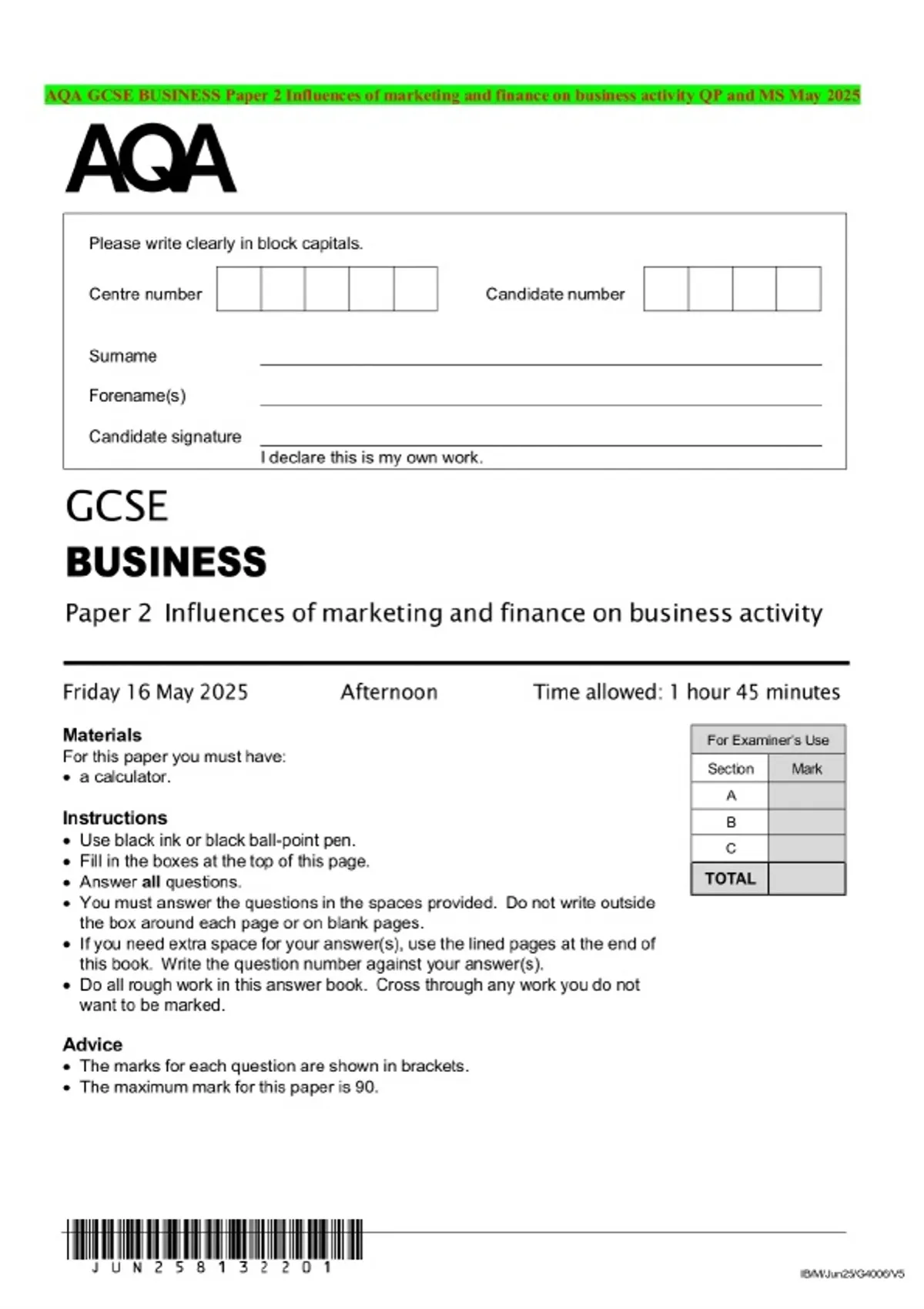 AQA GCSE BUSINESS Paper 2 Influences of marketing and finance on business activity QP and MS May 2025