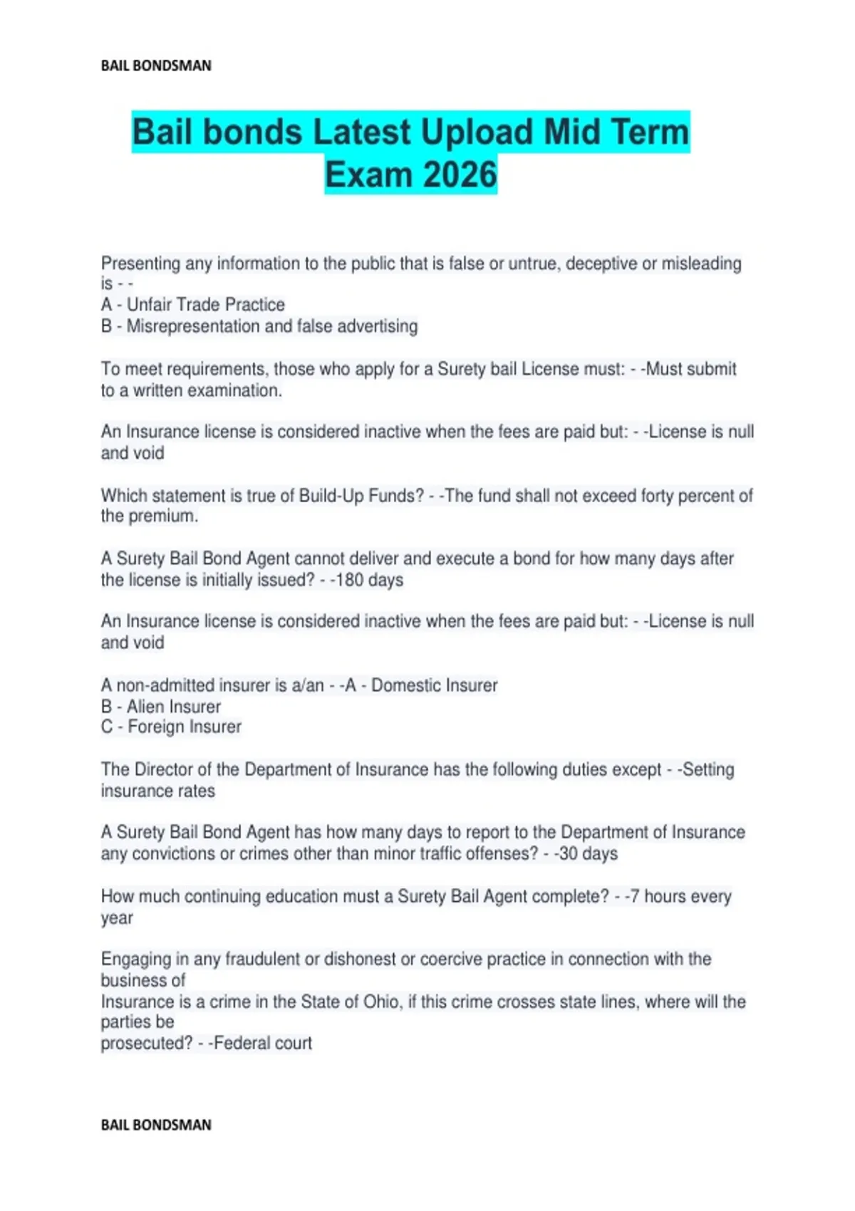 Bail bonds Latest Upload Mid Term Exam 2026 Presenting any information to the public that is false or untrue, deceptive or misleading is - - A - Unfair Trade Practice B - Misrepresentation and false advertising To meet requirements, those who apply for a Surety bail License must: - -Must submit to a written examination. An Insurance license is considered inactive when the fees are paid but: - -License is null and void Which statement is true of Build-Up Funds? - -The fund shall not exceed forty percent of the premium. A Surety Bail Bond Agent cannot deliver and execute a bond for how many days after the license is initially issued? - -180 days An Insurance license is considered inactive when the fees are paid but: - -License is null and void A non-admitted insurer is a/an - -A - Domestic Insurer B - Alien Insurer C - Foreign Insurer The Director of the Department of Insurance has the following duties except - -Setting insurance rates A Surety Bail Bond Agent has how many days to report to the Department of Insurance any convictions or crimes other than minor traffic offenses? - -30 days How much continuing education must a Surety Bail Agent complete? - -7 hours every year Engaging in any fraudulent or dishonest or coercive practice in connection with the business of Insurance is a crime in the State of Ohio, if this crime crosses state lines, where will the parties be prosecuted? - -Federal court BAIL BONDSMAN BAIL BONDSMAN If the Director of Insurance finds an agent guilty of Unfair Trade Practices, he may - -A - Order the insurer, agent, or agency to pay expenses incurred by the Director for the investigation. B - Order the person or company to cease and desist C - Suspend or revoke their license What are the requirements for a person to apply for a Surety Bail license? - -Be a person of high character and integrity. Who is responsible to show proof that the continuing education has been completed? - The Individual Licensee To transact surety business in the State of Ohio, the Ohio Department of Insurance must issue - -Certificate of authority Which persons are prohibited from executing bail bonds? - -A - Employees of detention centers. B - Court employees. Surety Bail Bond Agents shall maintain all record of Surety Bonds executed or countersigned by the agent for: - -Three years If a Surety Bail Bond Agent countersigns a Surety Bail Bond and sent an office secretary to go to the court house or jail to post a bond, this is: - -Not allowed Timely manner to fulfill a refund obligation is - -30 days Offering to divide and commission from the business of Surety Bail Bonds is called - Rebating When may the Director of the Ohio Department of Insurance make an examination of the financial conditions of a domestic insurance company transacting business within the State of Ohio? - -Whenever they deem necessary The surrender by one state or country to another of an individual accused of a crime is called: - -Extradition The detaining of a person by virtue of lawful process or authority is called: - -Custody Formal written accusation originating with the prosecutor and issued by a grand jury against a party charged with a crime is called: - -Indictment Which of the following statements is false? - -The surety bail bond agent can collect interest on collateral for his own benefits. BAIL BONDSMAN BAIL BONDSMAN The power of the court to take cases from particular geographical are and limits the boundaries is what jurisdiction? - -Limited The power that the public assumes the agent to have is? - -Apparent An order issued from a court requiring the performance of a specific act, giving authority to have it done is called. - -Writ How long shall a Surety Bail Bond Agent maintain his records? - -Three years after the bond is over The intentional misrepresentation, deceit, or concealment of a material fact know to a person with intentions of causing injury to the other party is called: - -Fraud A verbal agreement that sets the conditions of the agreement are: - -Informal When the applicant applies for a Surety Bail Bond by completing the application, this is considered - -Offer What are three types of authority that a Surety Bail Bond Agent has? - -Express, implied and apparent Where does a Build-Up fund have to be deposited? - -In a federally insured bank or savings and loan. When a judge releases a defendant after the defendant promises to re - -Recognizance What may a Surety Bail Bond Agent not do? - -A - Wear a shirt or jacket with his company logo to the jail B - Act as an attorney for his bond client C - Tell a bond client which attorney to use Where does a Surety Bail Bond Agent have to register in order to execute surety bail bonds in a county? - -C - With the Clerk of Court D - With the Clerk of Court of the Common Pleas Court Which of the following are unfair trade practices: - -A - Charging fees based on sex religion, creed, or national origin. B - Giving a defendant a rebate if you bond him out. C - Telling potential clients that a competitor charges higher premium (rates) to bond out. How much notice does the surety bail bond agent have to give the principal and the co signers in order to convert the collateral deposit into cash? - -Ten days BAIL BONDSMAN BAIL BONDSMAN What actions is not prohibited for Surety Bail Bond Agents - -Placing an advertisement in the telephone book Who cannot arrest a Fugitive Bond Jumper in this state when the bond was written in another state? - -A private investigator licensed in this state Acceptable forms of collateral are: - -A - Cash B - Real property C - Promissory note D - Indemnity agreement Which statement is true about property bonds? - -The defendant can only post his own property with the court Who is always the obligee on a bail bond in the State Court? - -State of Ohio Which statements are not true? - -You can forfeit the bond amount on a felony with no other consequences Who gets the interest earned on cash collateral? - -The Surety Bail Bond Ag