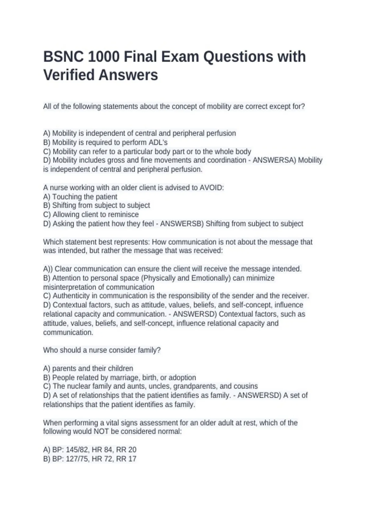 All of the following statements about the concept of mobility are correct except for? A) Mobility is independent of central and peripheral perfusion B) Mobility is required to perform ADL's C) Mobility can refer to a particular body part or to the whole body D) Mobility includes gross and fine movements and coordination - ANSWERSA) Mobility is independent of central and peripheral perfusion. A nurse working with an older client is advised to AVOID: A) Touching the patient B) Shifting from subject to subject C) Allowing client to reminisce D) Asking the patient how they feel - ANSWERSB) Shifting from subject to subject Which statement best represents: How communication is not about the message that was intended, but rather the message that was received: A)) Clear communication can ensure the client will receive the message intended. B) Attention to personal space (Physically and Emotionally) can minimize misinterpretation of communication C) Authenticity in communication is the responsibility of the sender and the receiver. D) Contextual factors, such as attitude, values, beliefs, and self-concept, influence relational capacity and communication. - ANSWERSD) Contextual factors, such as attitude, values, beliefs, and self-concept, influence relational capacity and communication. Who should a nurse consider family? A) parents and their children B) People related by marriage, birth, or adoption C) The nuclear family and aunts, uncles, grandparents, and cousins D) A set of relationships that the patient identifies as family. - ANSWERSD) A set of relationships that the patient identifies as family.