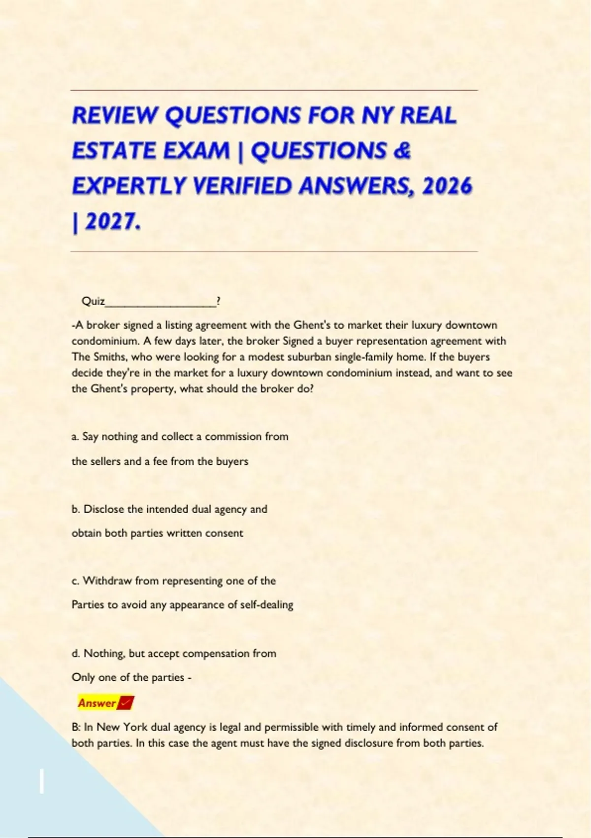 REVIEW QUESTIONS FOR NY REAL ESTATE EXAM | QUESTIONS & EXPERTLY VERIFIED ANSWERS, 2026 | 2027. Quiz_________________? -A broker signed a listing agreement with the Ghent's to market their luxury downtown condominium. A few days later, the broker Signed a buyer representation agreement with The Smiths, who were looking for a modest suburban single-family home. If the buyers decide they're in the market for a luxury downtown condominium instead, and want to see the Ghent's property, what should the broker do? a. Say nothing and collect a commission from the sellers and a fee from the buyers b. Disclose the intended dual agency and obtain both parties written consent c. Withdraw from representing one of the Parties to avoid any appearance of self-dealing d. Nothing, but accept compensation from Only one of the parties - Answer B: In New York dual agency is legal and permissible with timely and informed consent of both parties. In this case the agent must have the signed disclosure from both parties. Quiz_________________? -A legally enforceable agreement between competent parties in which each party acquires a right is called a a. Certiorari. b. Consideration. c. Contract. d. Clause. - Answer C: A contract is an agreement between competent legal parties to do or refrain from doing some legal act in exchange for consideration. Quiz_________________? -A real estate salesperson's compensation is set by a. The local realty association. b. The Department of State, Division of Licensing Services. c. Agreement between broker and salesperson. d. The cooperating broker in a transaction. - Answer C: The fee or rate of commission paid to a real estate broker is strictly negotiable between the broker and the seller or buyer. Quiz_________________? -A tenant learns her building has been sold to a new landlord. The sale of the property a. Automatically terminates all preexisting leases. b. Automatically renews the lease for an additional term, although the tenant has the option of declining the renewal. c. has no effect on existing leases, and the tenant must make timely rent payments to the new owner. d. terminates the lease, but the tenant is entitled to a legal holdover tenancy for the remainder of the lease term. - Answer C: Lease agreement does not terminate when an owner sells, new owner is bound by terms of lease Quiz_________________? -Charging more than the legal interest rate is Known as a. points b. usury c. discounting d. novation - Answer B: USURY LAWS are used by New York State to fix a maximum allowable interest rate. Quiz_________________? -Deed restrictions may be established only by the a. Grantor. b. Local government. c. Zoning board of appeals. d. Grantee. - Answer A: Deed restrictions are in the form of covenants or conditions. These restrictions run with the land, they are put by the "grantor" Quiz_________________? -In a real estate transaction, a broker had a written representation agreement with the buyer but was paid 6 percent of the selling price at the closing by the seller. Under these facts, whose agent was this broker? a. The broker was the seller's agent. b. The broker was the buyer's agent. c. The broker is a dual agent. d. The broker has violated New York's real Estate license laws and may have his or her License suspended or revoked. - Answer B: Other means of payment can be through multiple listing services when the listing broker offers cooperating compensation to the buyer broker. The buyer broker will then be paid by the seller