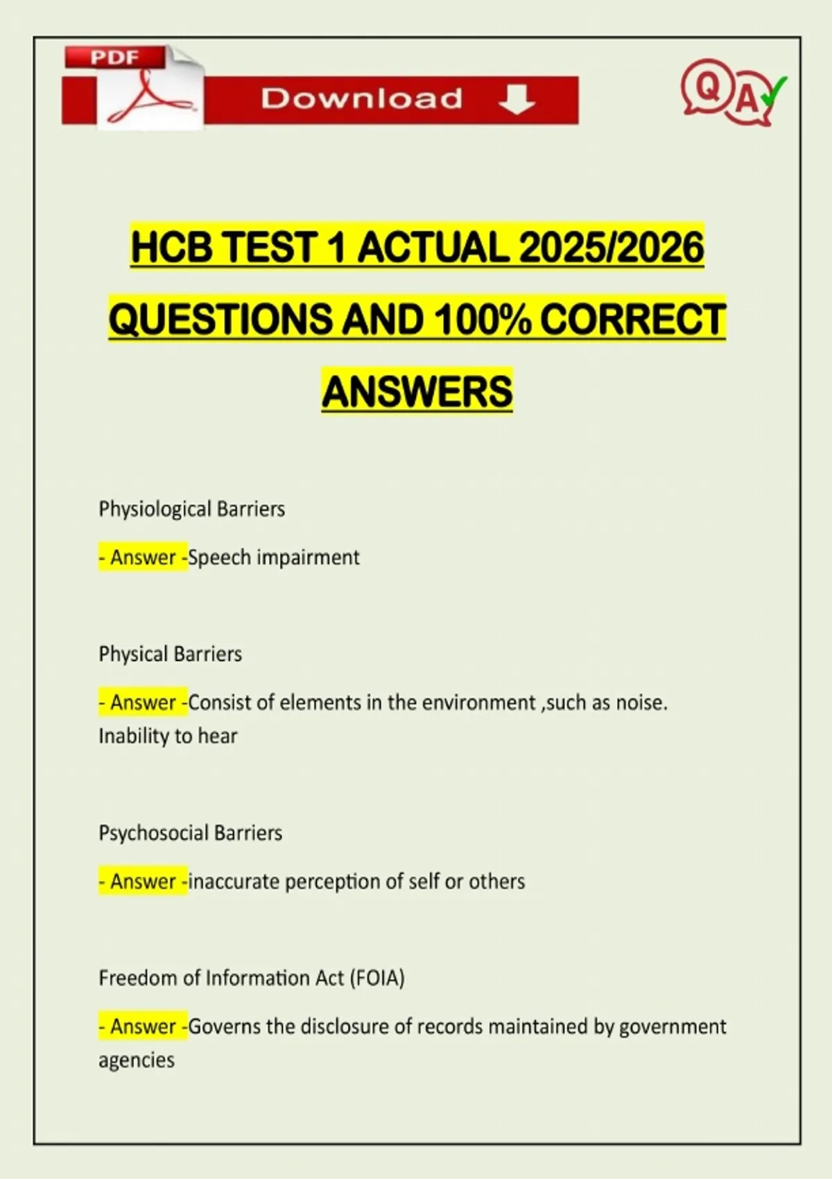 HCB TEST 1 ACTUAL 2025/2026 QUESTIONS AND 100% CORRECT ANSWERS Physiological Barriers - Answer -Speech impairment Physical Barriers - Answer -Consist of elements in the environment ,such as noise. Inability to hear Psychosocial Barriers - Answer -inaccurate perception of self or others Freedom of Information Act (FOIA) - Answer -Governs the disclosure of records maintained by government agenciesNeed assistance on Online classes, Exams & Assignments? Reach out for instant help!! Full Course Assistance, Plagiarism-free Essay Writing, Research Paper, Dissertation, Discussion Posts, etc…. Confidential & Secure services. Tutors are available for all subjects! Email now at: Health Insurance Portability and Accountability Act (HIPAA) - Answer -A federal law that required the creation of national standards to protect sensitive patient health information from being disclosed without the patient consent or knowledge . Protected Health Information (PHI)
