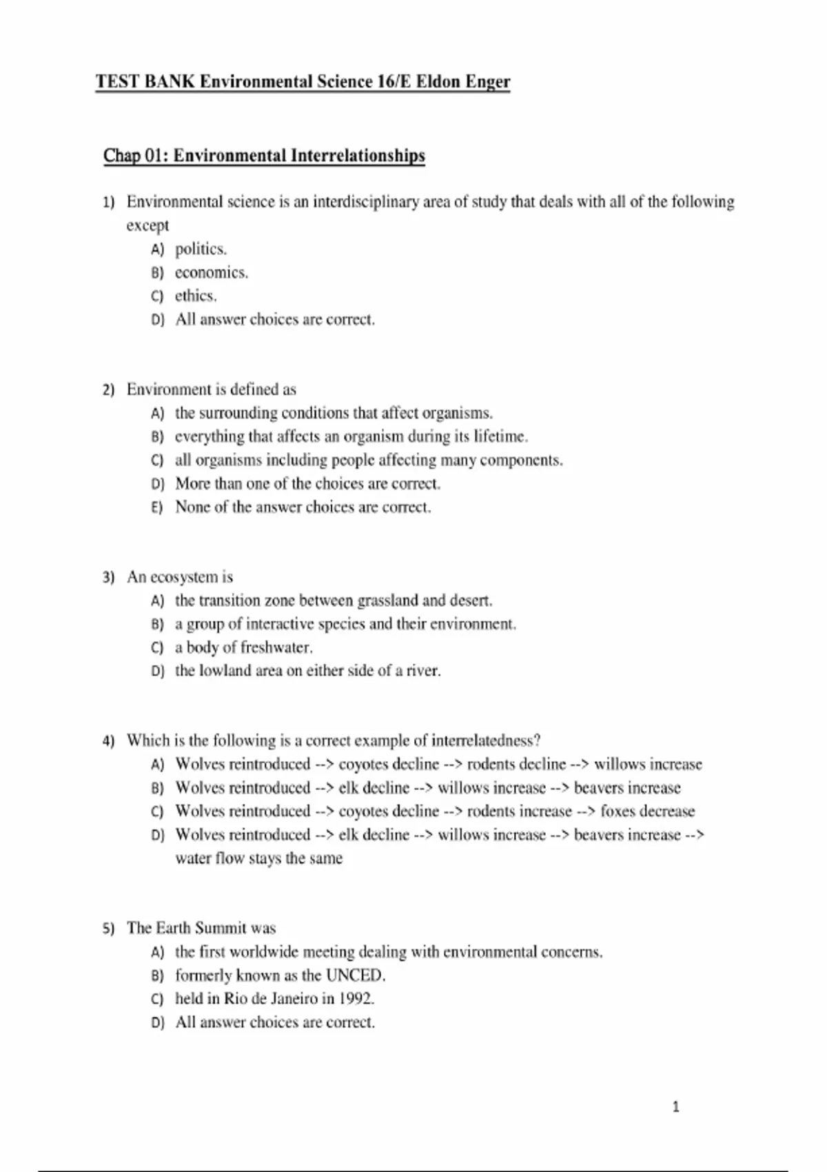 Description: This comprehensive test bank for *Environmental Science 16/E* by Eldon Enger includes all questions and verified answer keys for Chapters 1 through 17. Perfect for instructors preparing exams, quizzes, or study guides, and for students seeking additional practice. Each chapter contains multiple-choice, matching, short answer, and essay questions covering key topics such as environmental interrelationships, ethics, ecosystems, biodiversity, energy, pollution, climate change, and sustainability. Fully organized and ready to use. Chapters Covered: Chap 01: Environmental Interrelationships Chap 02: Environmental Ethics Chap 03: Environmental Risk & Economics Chap 04: Science & Systems Chap 05: Ecosystems & Energy Flow Chap 06: Biomes & Succession Chap 07: Population Ecology Chap 08: Energy & Society Chap 09: Fossil Fuels & Nuclear Energy Chap 10: Renewable Energy Chap 11: Biodiversity & Conservation Chap 12: Land Use & Urbanization Chap 13: Soil & Agriculture Chap 14: Sustainable Agriculture & Pest Management Chap 15: Water Resources & Pollution Chap 16: Air Pollution & Atmosphere Chap 17: Climate Change & Global Warming