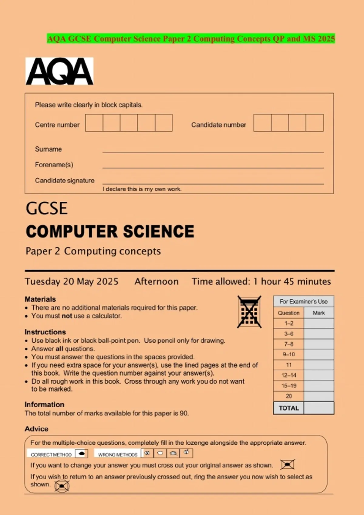 BUNDLE ::: AQA GCSE COMPUTER SCIENCE 2025 Combined Question Paper and Mark Scheme
