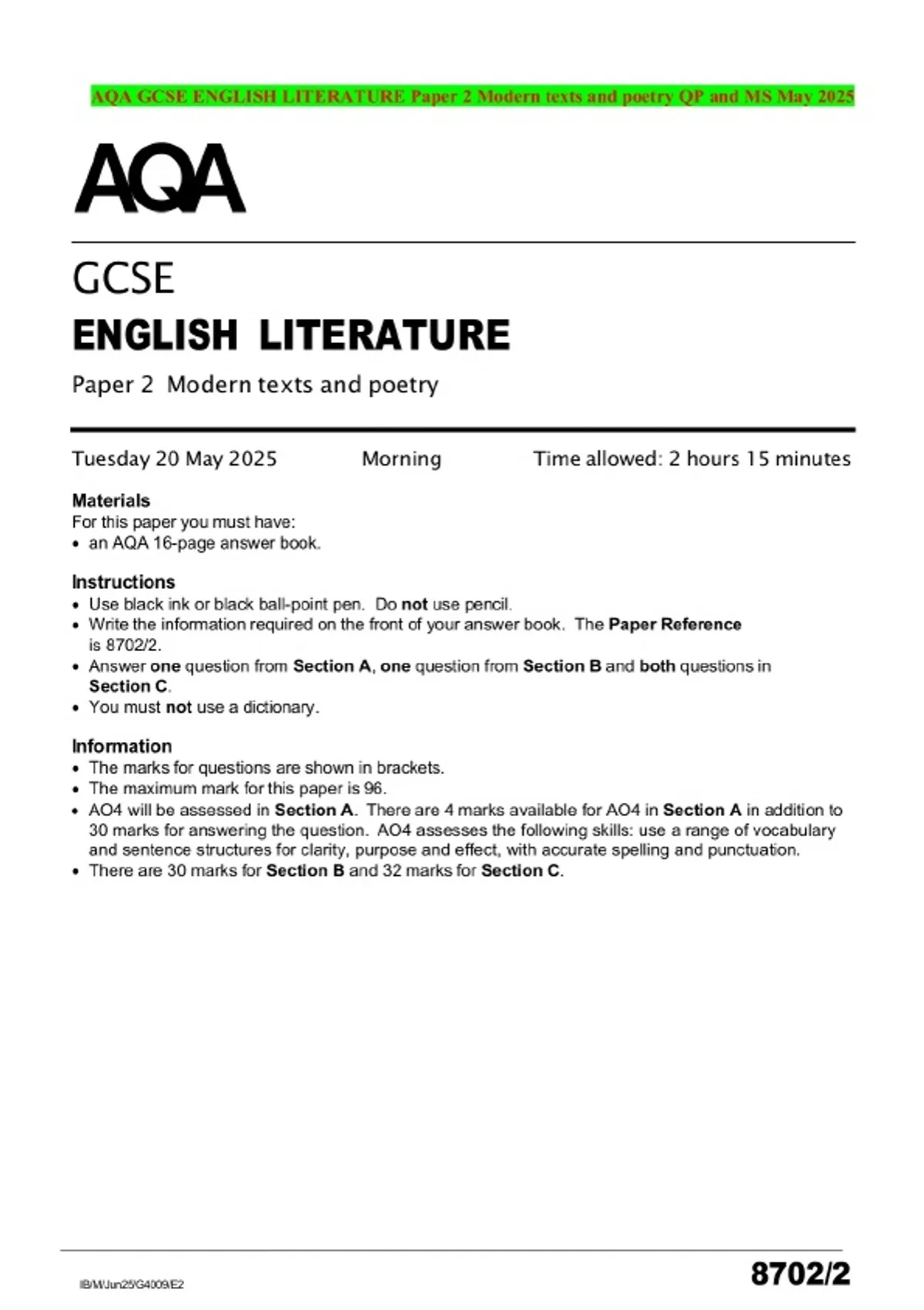 AQA GCSE ENGLISH LITERATURE Paper 2 Modern texts and poetry QP and MS May 2025