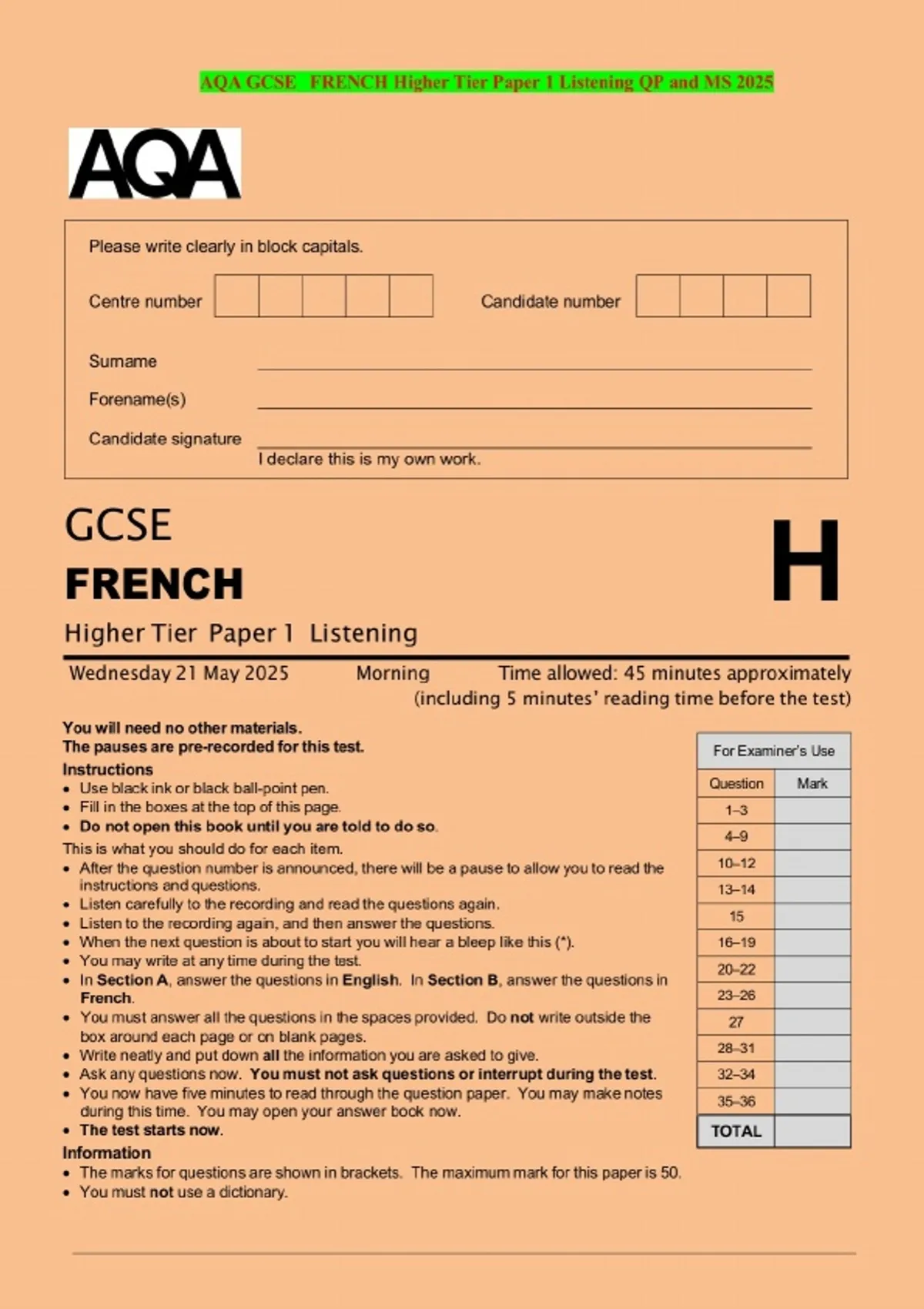 AQA GCSE FRENCH Higher Tier Paper 1 Listening QP and MS 2025