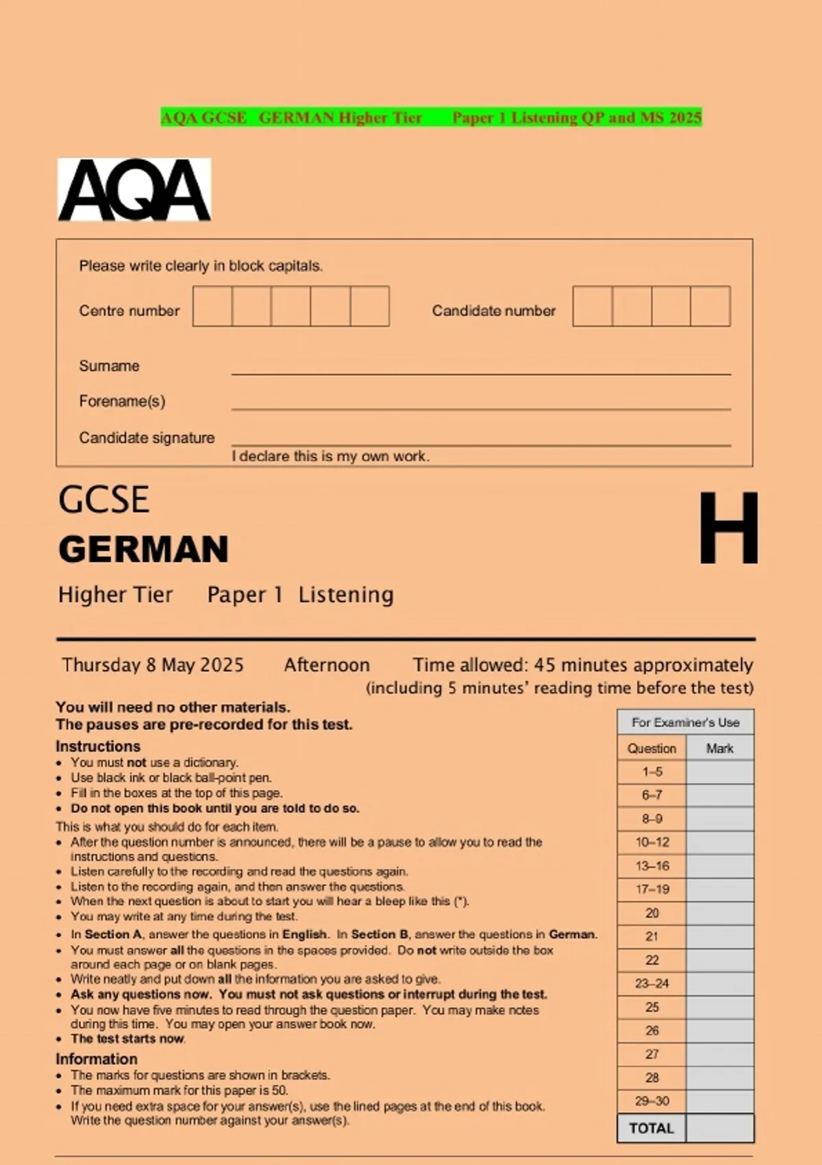 AQA GCSE GERMAN Higher Tier Paper 1 Listening QP and MS 2025