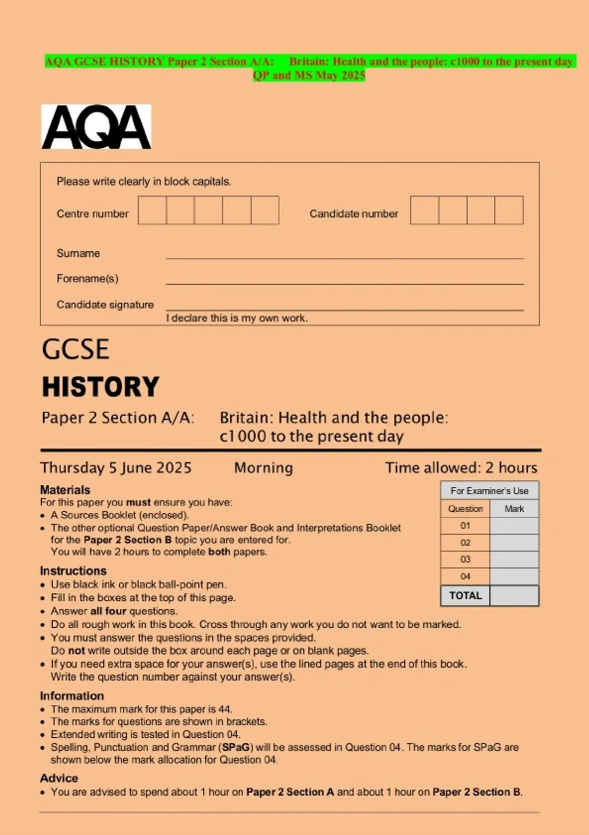 AQA GCSE HISTORY Paper 2 Section A/A: Britain: Health and the people: c1000 to the present day QP and MS May 2025