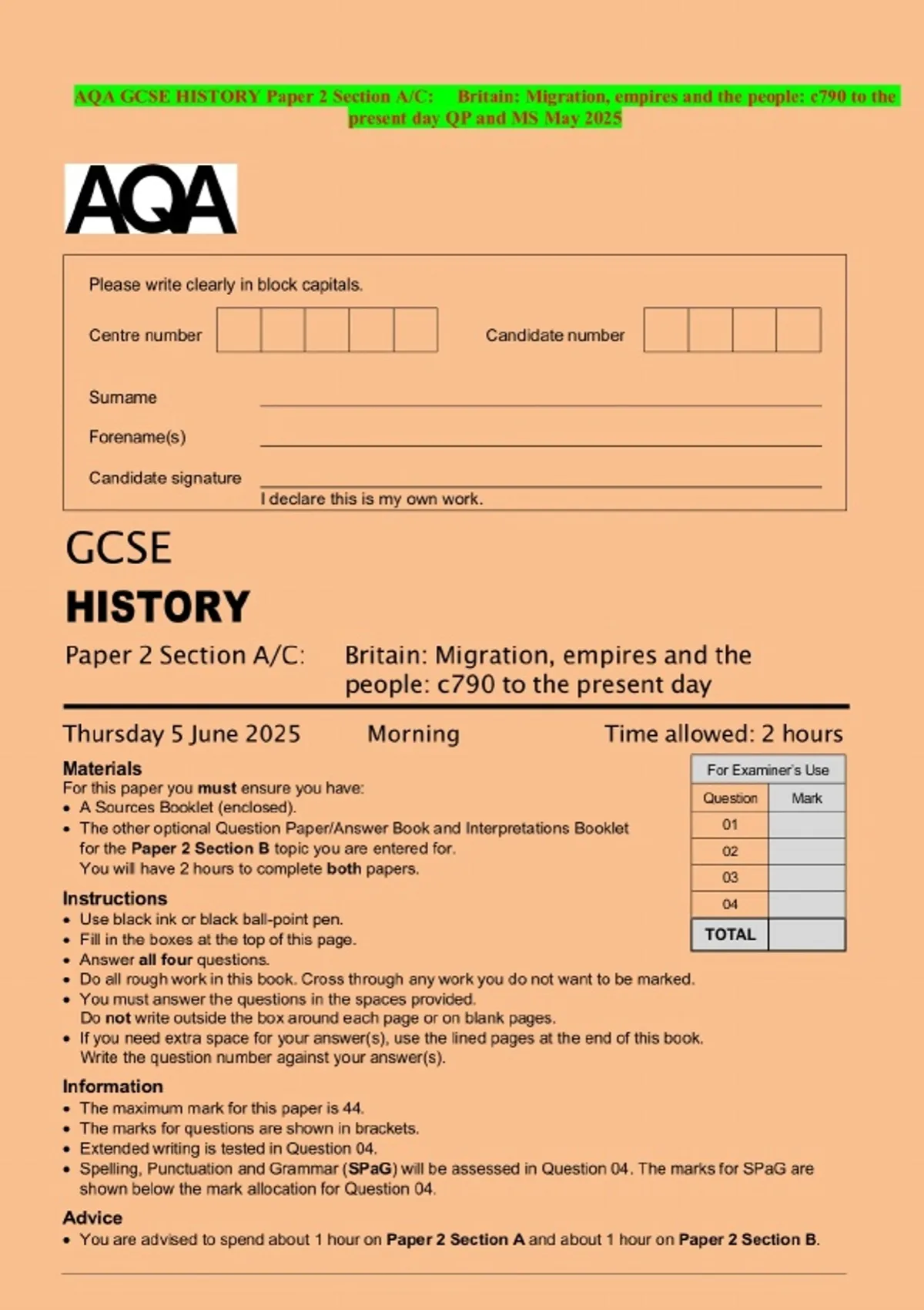 AQA GCSE HISTORY Paper 2 Section A/C: Britain: Migration, empires and the people: c790 to the present day QP and MS May 2025