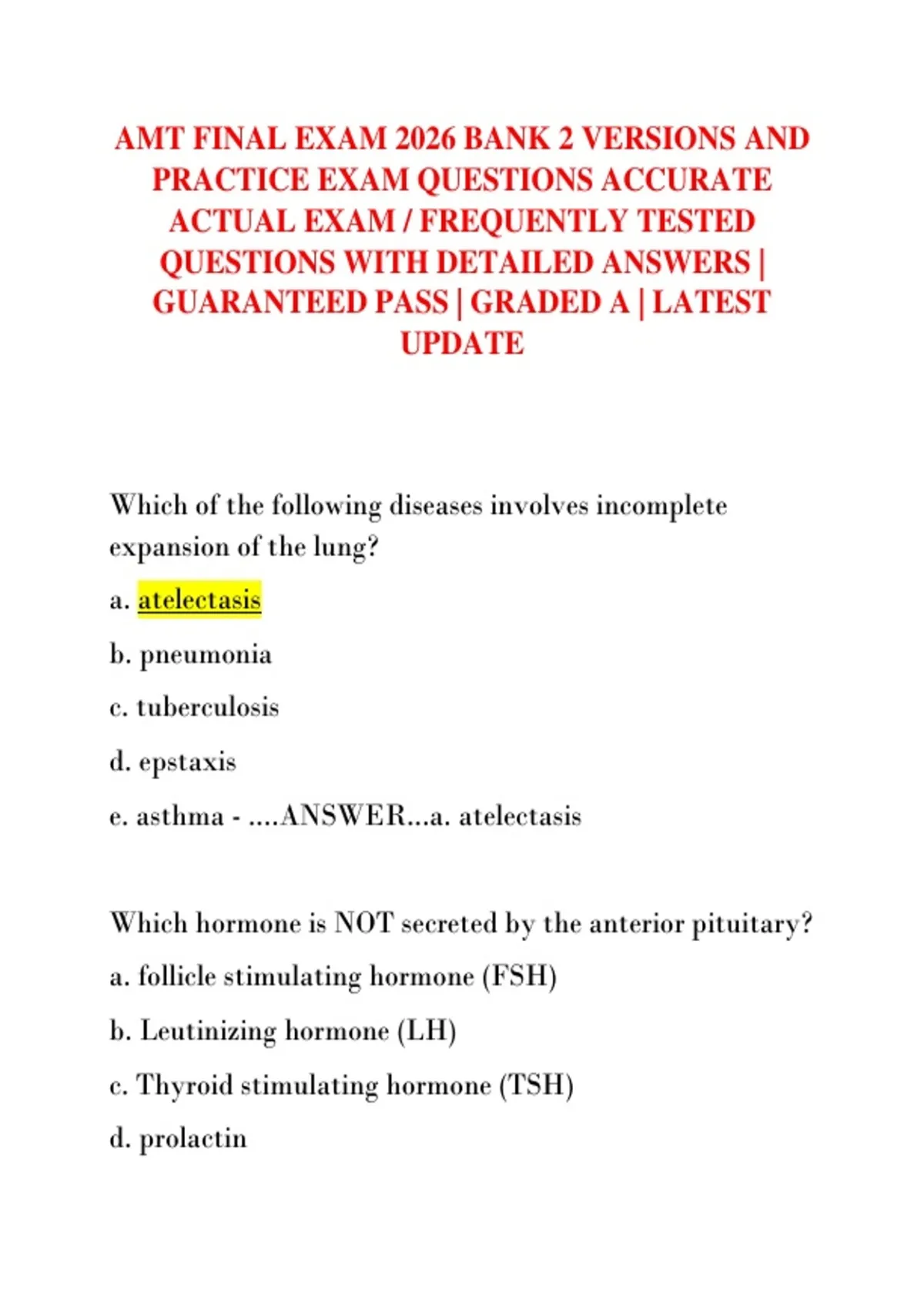 AMT FINAL EXAM 2026 BANK 2 VERSIONS AND PRACTICE EXAM QUESTIONS ACCURATE ACTUAL EXAM / FREQUENTLY TESTED QUESTIONS WITH DETAILED ANSWERS | GUARANTEED PASS | GRADED A | LATEST UPDATE