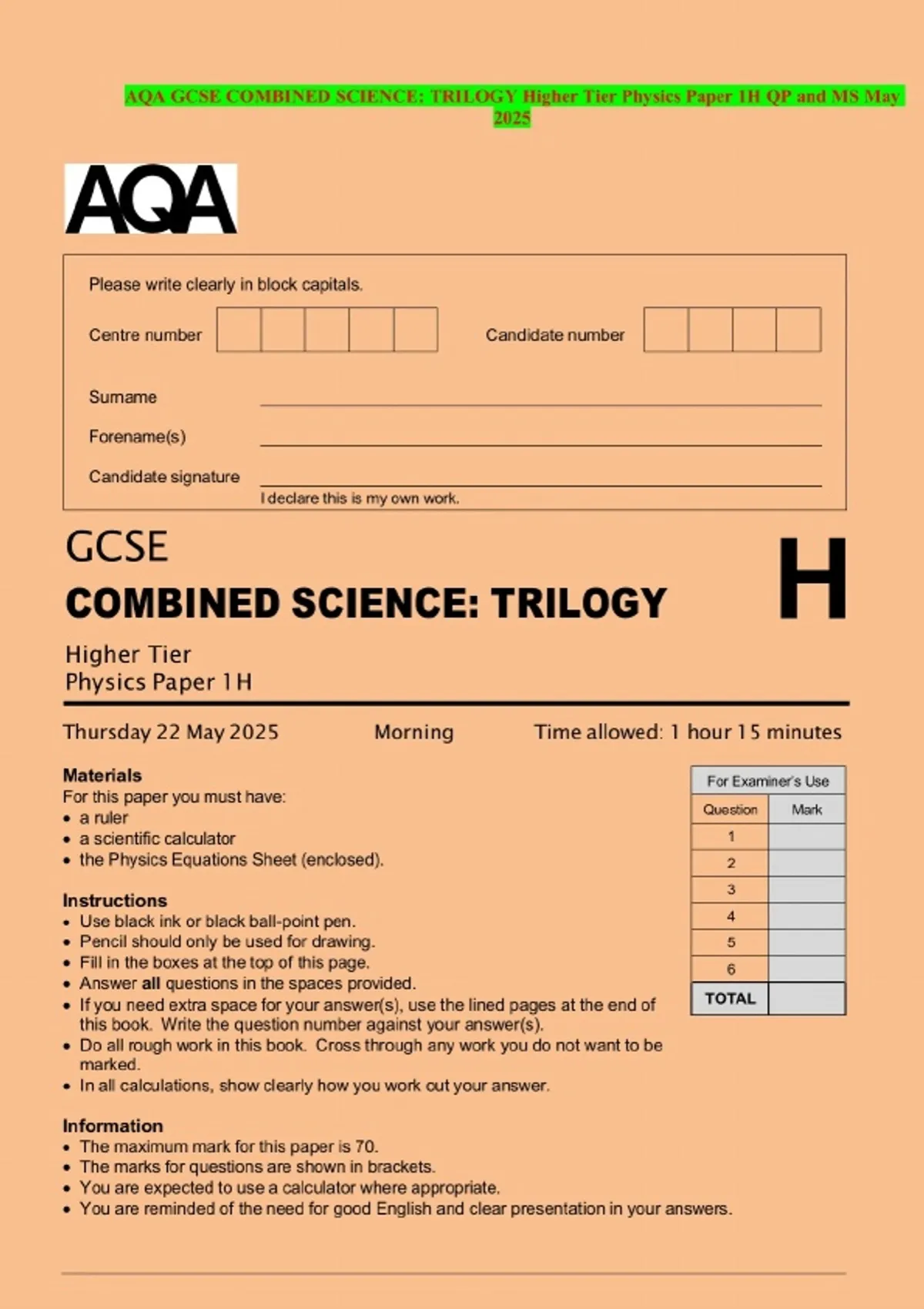 AQA GCSE COMBINED SCIENCE: TRILOGY Higher Tier Physics Paper 1H QP and MS May 2025