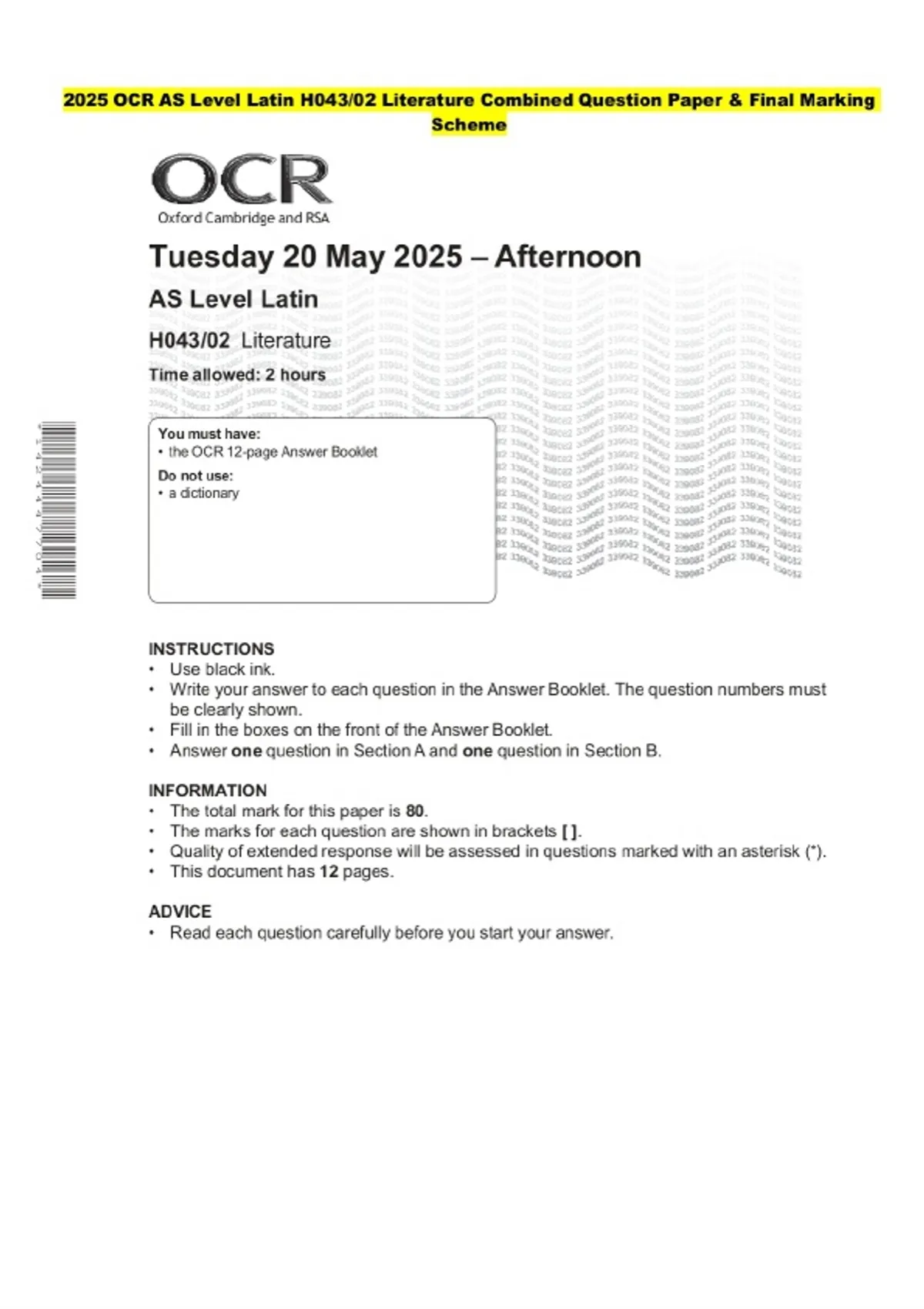 2025 OCR AS Level Latin H043/02 Literature Question Paper and Final Evaluation Scheme