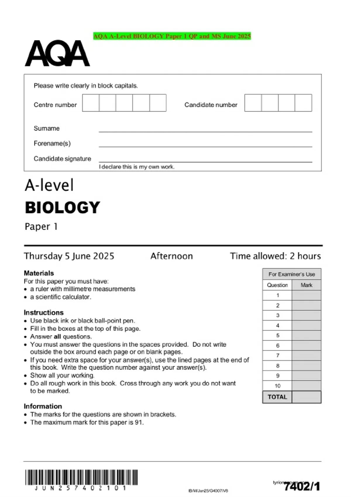 AQA A-Level BIOLOGY Paper 1 QP and MS June 2025