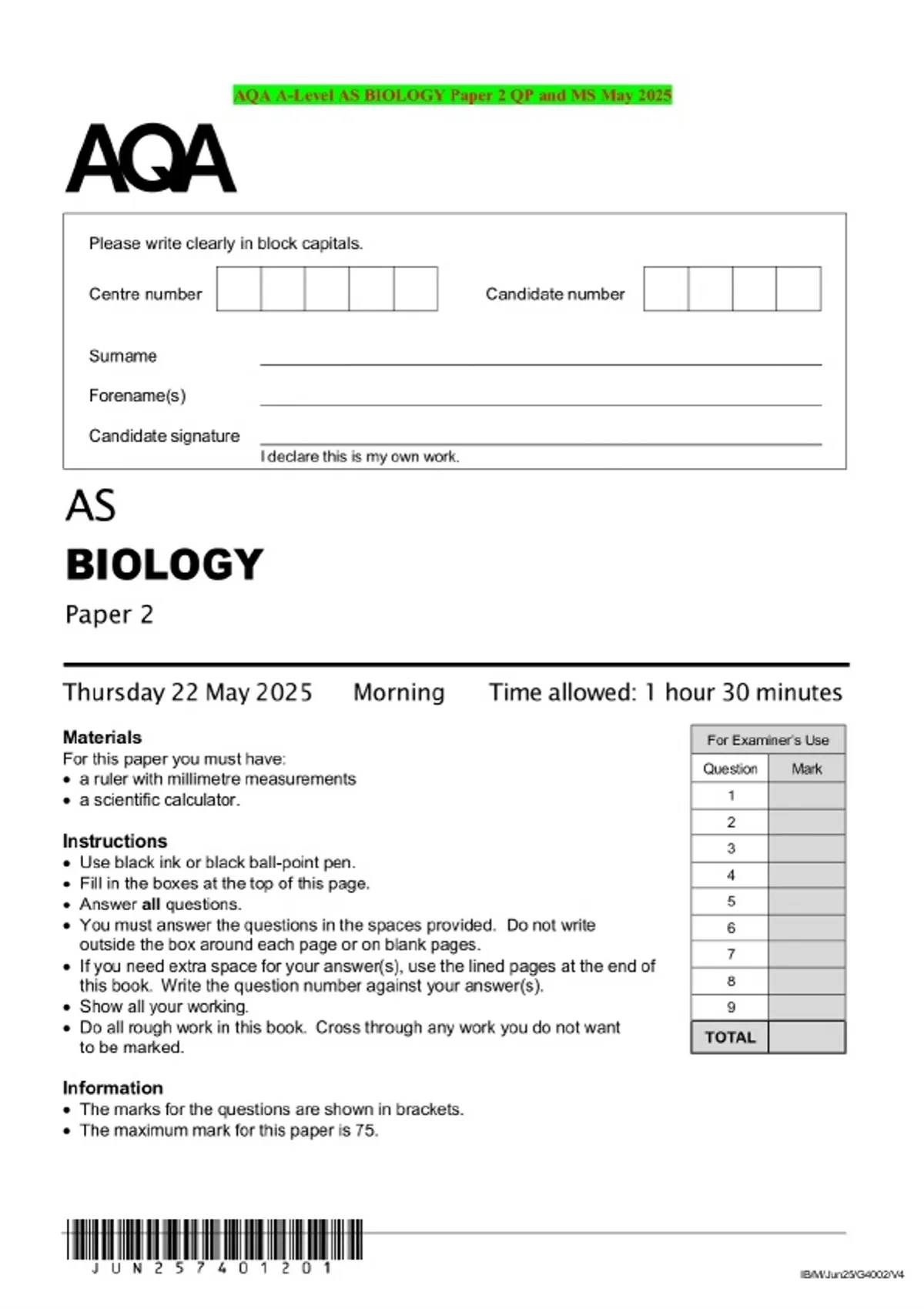 AQA A-Level AS BIOLOGY Paper 2 QP and MS May 2025