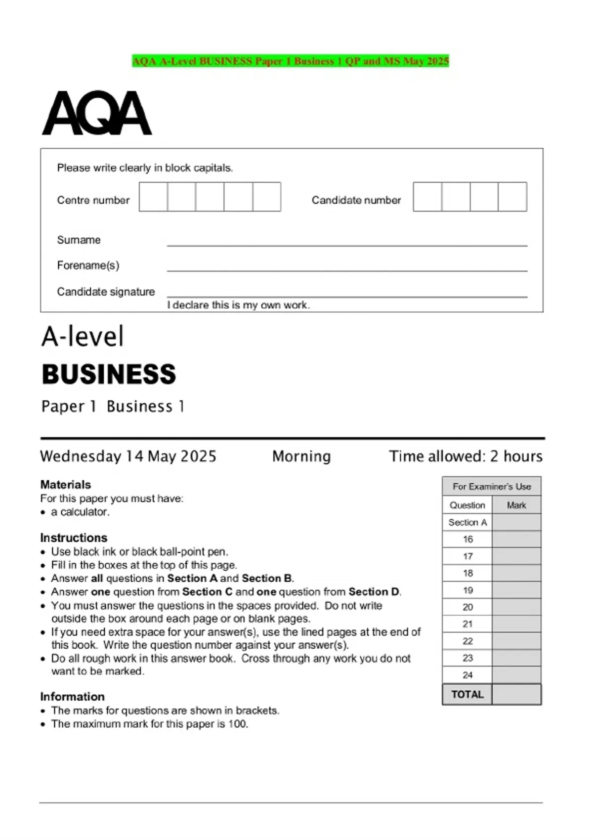 AQA A-Level BUSINESS Paper 1 Business 1 QP and MS May 2025