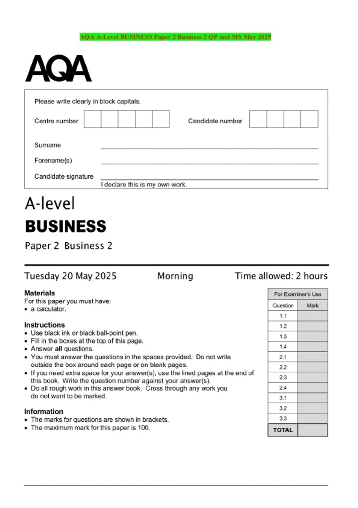 AQA A-Level BUSINESS Paper 2 Business 2 QP and MS May 2025