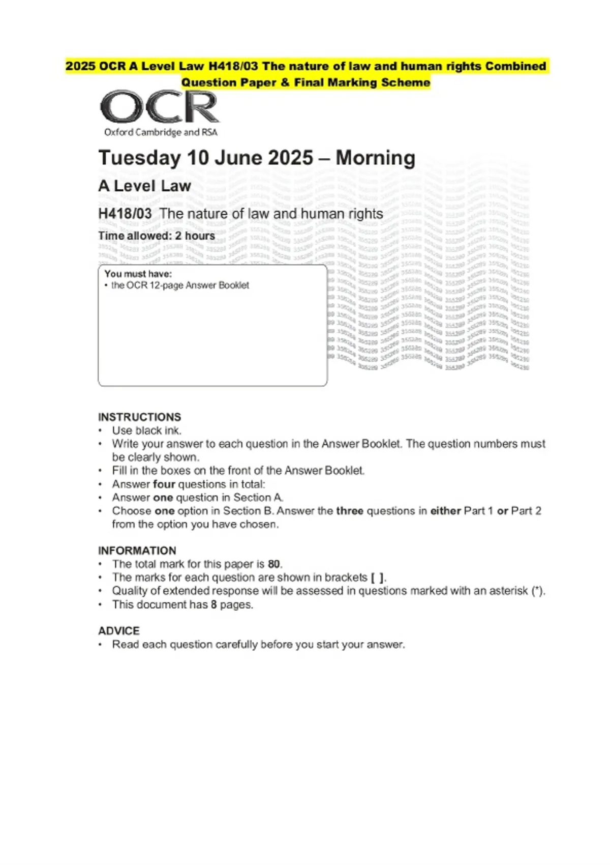 2025 OCR A Level Law H418/03 The nature of law and human rights Question Paper and Final Evaluation Scheme