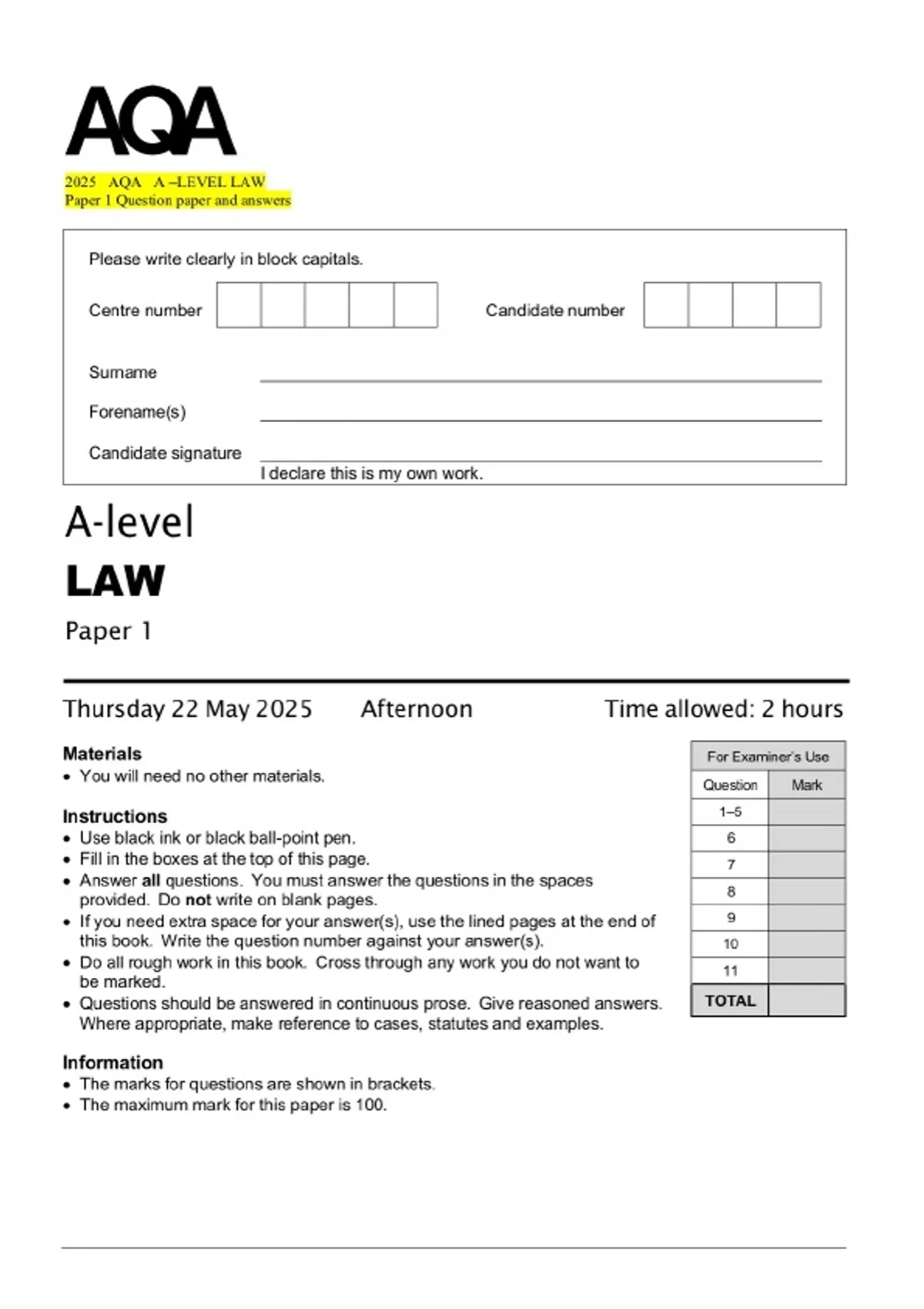2025 AQA A –LEVEL LAW Paper 1 Question Paper and Final Evaluation Scheme