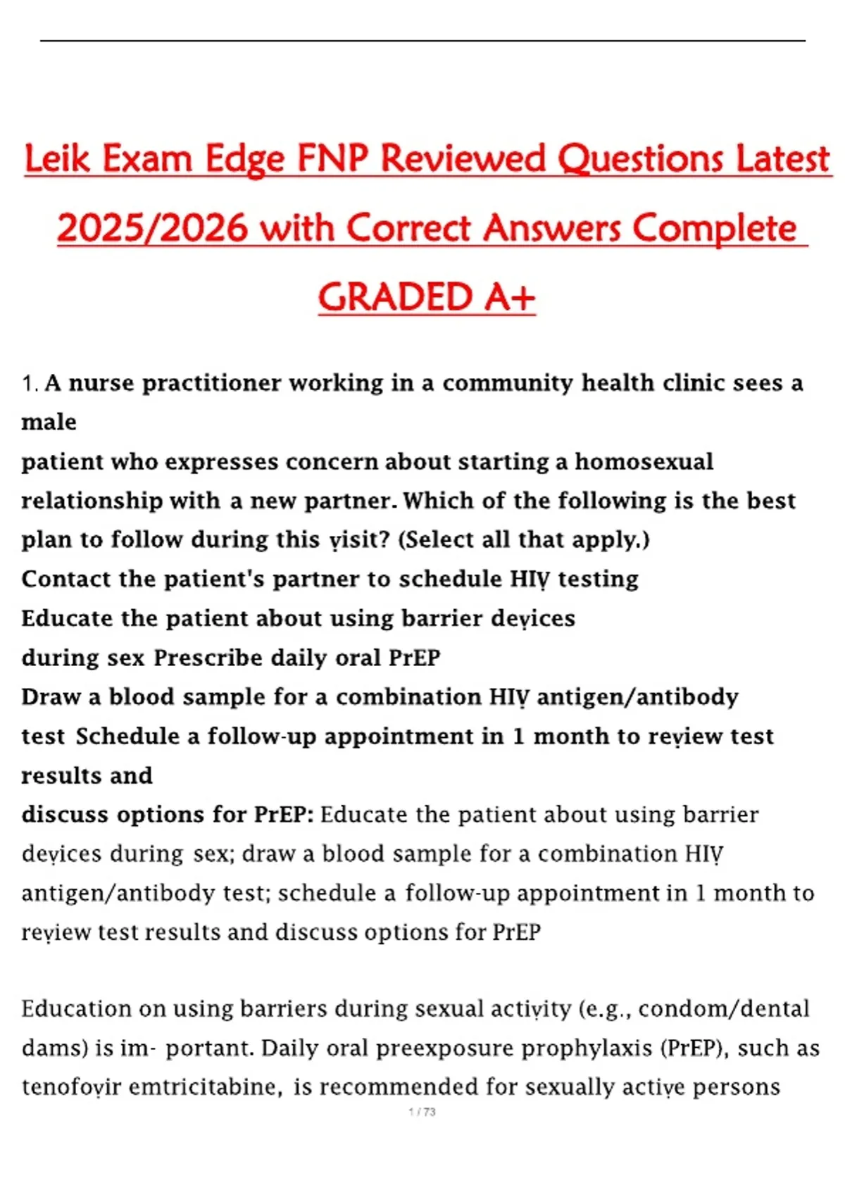 This document contains reviewed practice questions from Leik Exam Edge for the Family Nurse Practitioner (FNP) exam, with correct answers updated for the 2025–2026 exam cycle. It covers key clinical topics and exam-style scenarios, making it ideal for comprehensive review, self-testing, and final preparation for FNP certification.