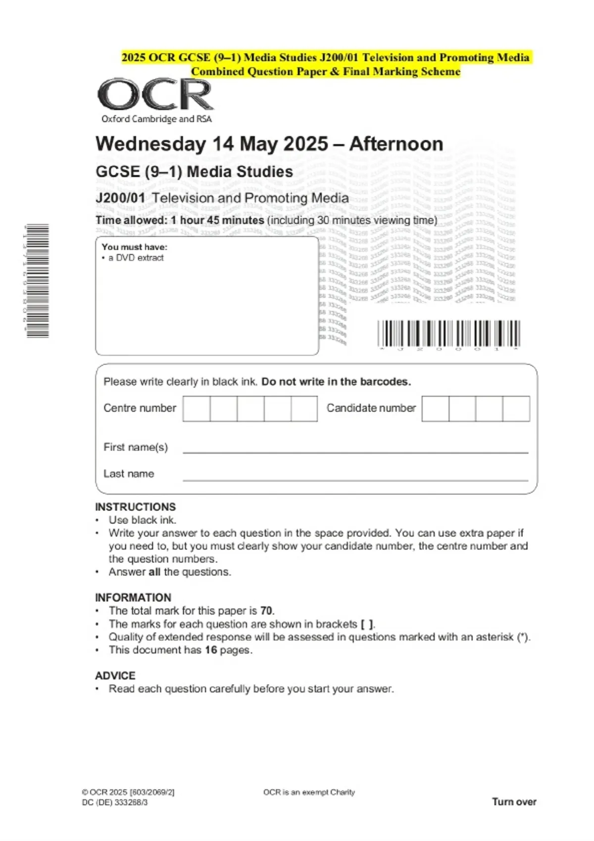 2025 OCR GCSE (9–1) Media Studies J200/01 Television and Promoting Media Question Paper and Final Evaluation Scheme
