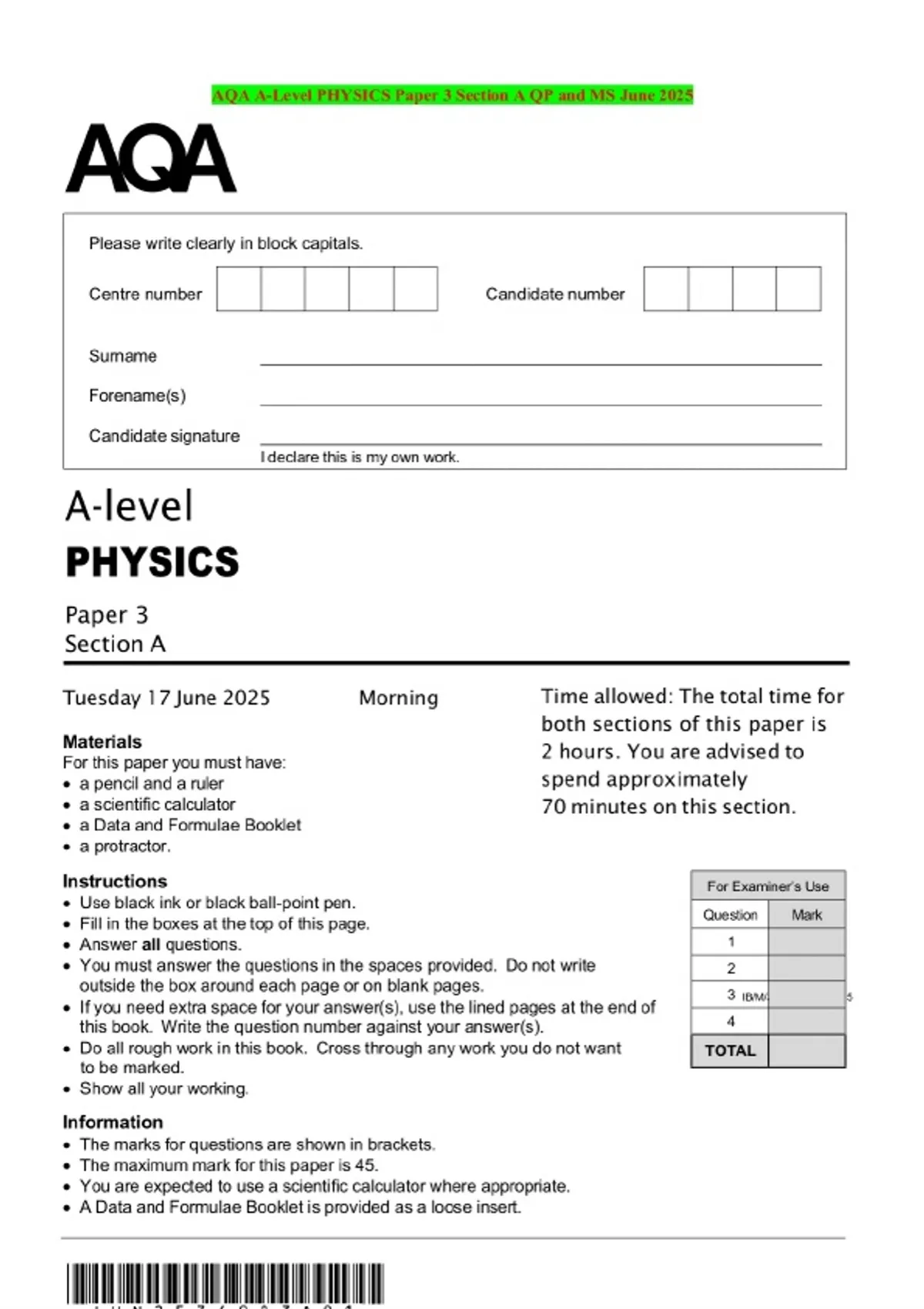 AQA A-Level PHYSICS Paper 3 Section A QP and MS June 2025