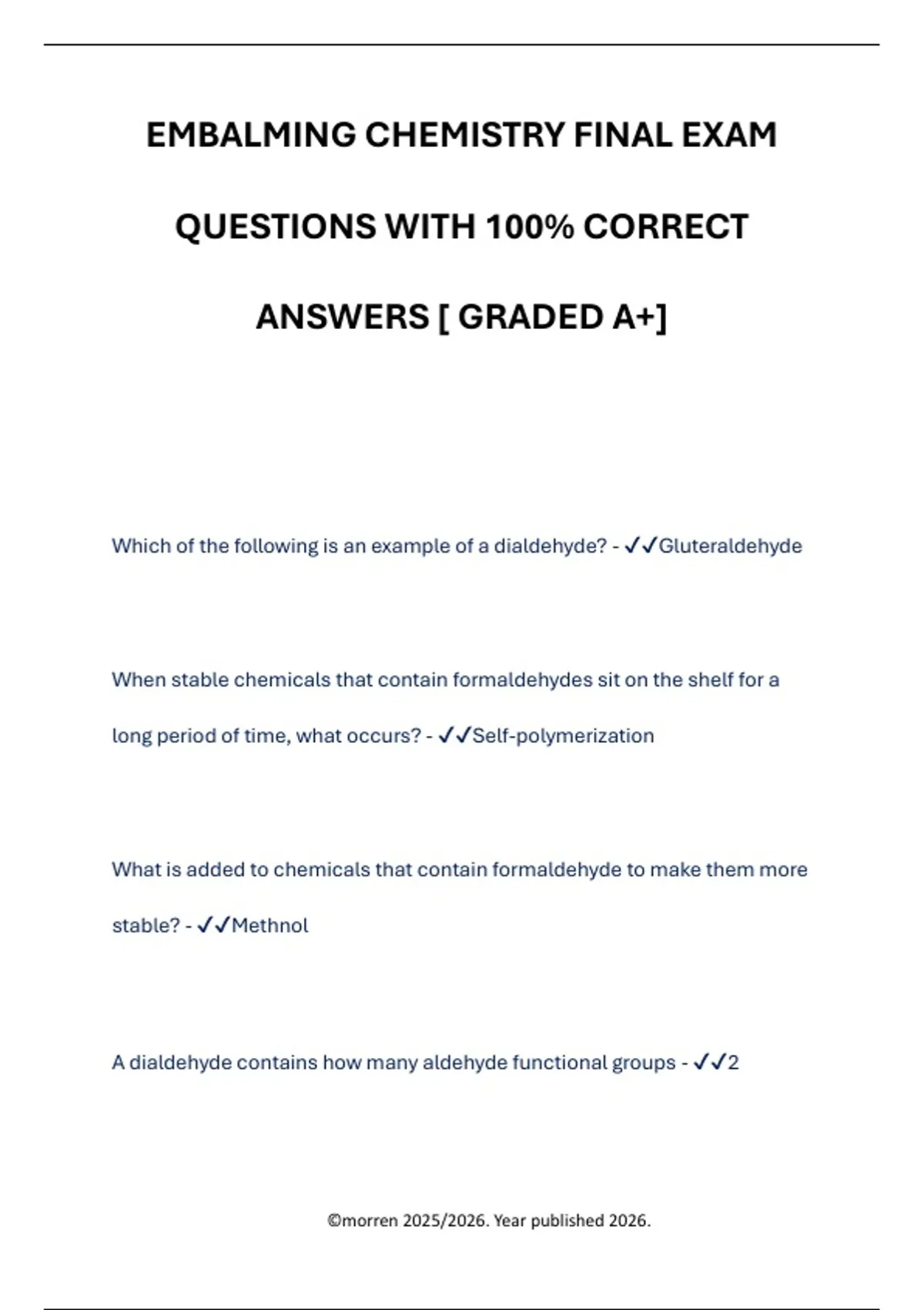EMBALMING CHEMISTRY FINAL EXAM QUESTIONS WITH 100% CORRECT ANSWERS [ GRADED A+] Which of the following is an example of a dialdehyde? - Gluteraldehyde When stable chemicals that contain formaldehydes sit on the shelf for a long period of time, what occurs? - Self-polymerization What is added to chemicals that contain formaldehyde to make them more stable? - Methnol A dialdehyde contains how many aldehyde functional groups - 2 ©morren 2025/2026. Year published 2026. This preservative is in solid form that contains formaldehyde. Can be used in autopsy case or trauma cases for improved preservation of tissues with a compromised vascular system - Paraformaldehyde In an aqueous solution, formaldehyde is referred to as - Formalin Which of the following is a beneficial characteristic of glutaraldehyde for embalmers in the prep room? - Has a broader pH range An Aromatic Aldehyde has which functional group that allows it to have a fragrance property - Arene functional group When discussing Ketones, which of the following is a popular solvent in the funeral home - Acetone Formaldehyde is the street name for which of the following - Methanal ©morren 2025/2026. Year published 2026.