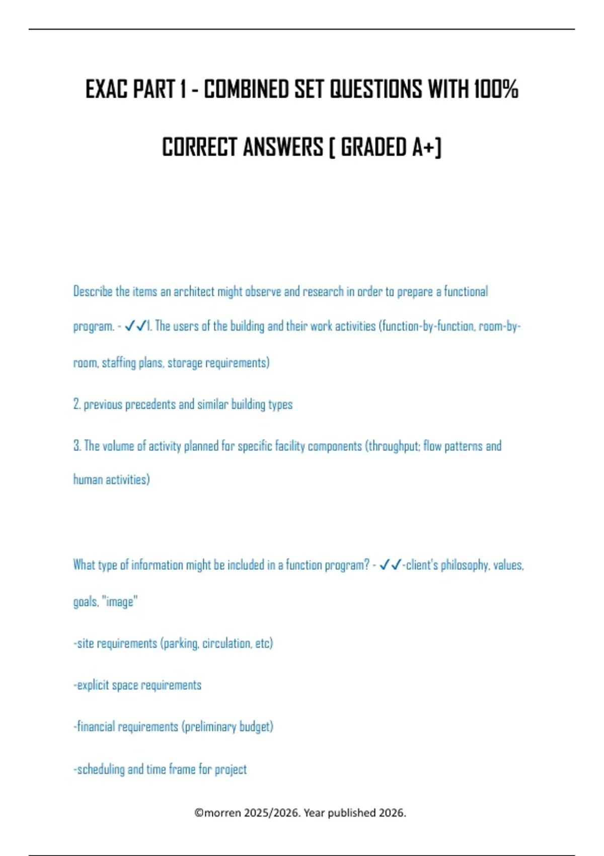 EXAC PART 1 - COMBINED SET QUESTIONS WITH 100% CORRECT ANSWERS [ GRADED A+] Describe the items an architect might observe and research in order to prepare a functional program. - 1. The users of the building and their work activities (function-by-function, room-by room, staffing plans, storage requirements) 2. previous precedents and similar building types 3. The volume of activity planned for specific facility components (throughput; flow patterns and human activities) What type of information might be included in a function program? - -client's philosophy, values, goals, "image" -site requirements (parking, circulation, etc) -explicit space requirements -financial requirements (preliminary budget) -scheduling and time frame for project ©morren 2025/2026. Year published 2026. -regulatory issues (building code, zoning, municipal bylaws, etc) -recommended project delivery method Is functional programming typically part of basic services of an architectural agreement? - No. What is a functional program? - The decision-making process that clearly defines the problem and scope of work for design. Identify some sustainable development principles which would affect the architectural program? - 1. Siting, Building form, orientation 2. Energy performance 3. Operational systems 4. Space and Use Parameters Identify three physical factors related to site design - 1. Climate (solar orientation, prevailing winds, etc) 2. Topography (contours, elevations, setbacks, easements) ©morren 2025/2026. Year published 2026.