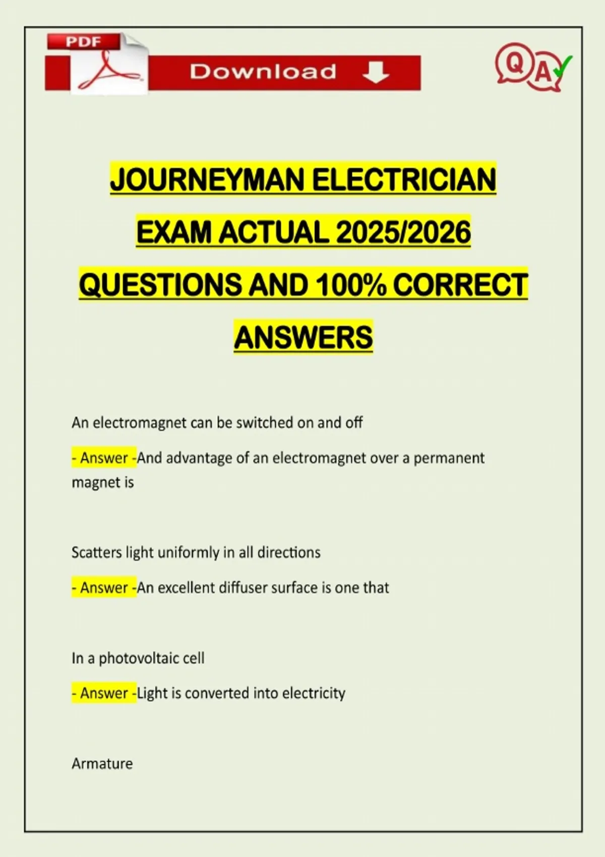 JOURNEYMAN ELECTRICIAN EXAM ACTUAL 2025/2026 QUESTIONS AND 100% CORRECT ANSWERS An electromagnet can be switched on and off - Answer -And advantage of an electromagnet over a permanent magnet is Scatters light uniformly in all directions - Answer -An excellent diffuser surface is one that In a photovoltaic cell - Answer -Light is converted into electricity ArmatureNeed assistance on Online classes, Exams & Assignments? Reach out for instant help!! Full Course Assistance, Plagiarism-free Essay Writing, Research Paper, Dissertation, Discussion Posts, etc…. Confidential & Secure services. Tutors are available for all subjects! Email now at: - Answer -The rotating part of a DC motor is known as Fish tape - Answer -A device used to pull wires through a conduit is called Approximately zero