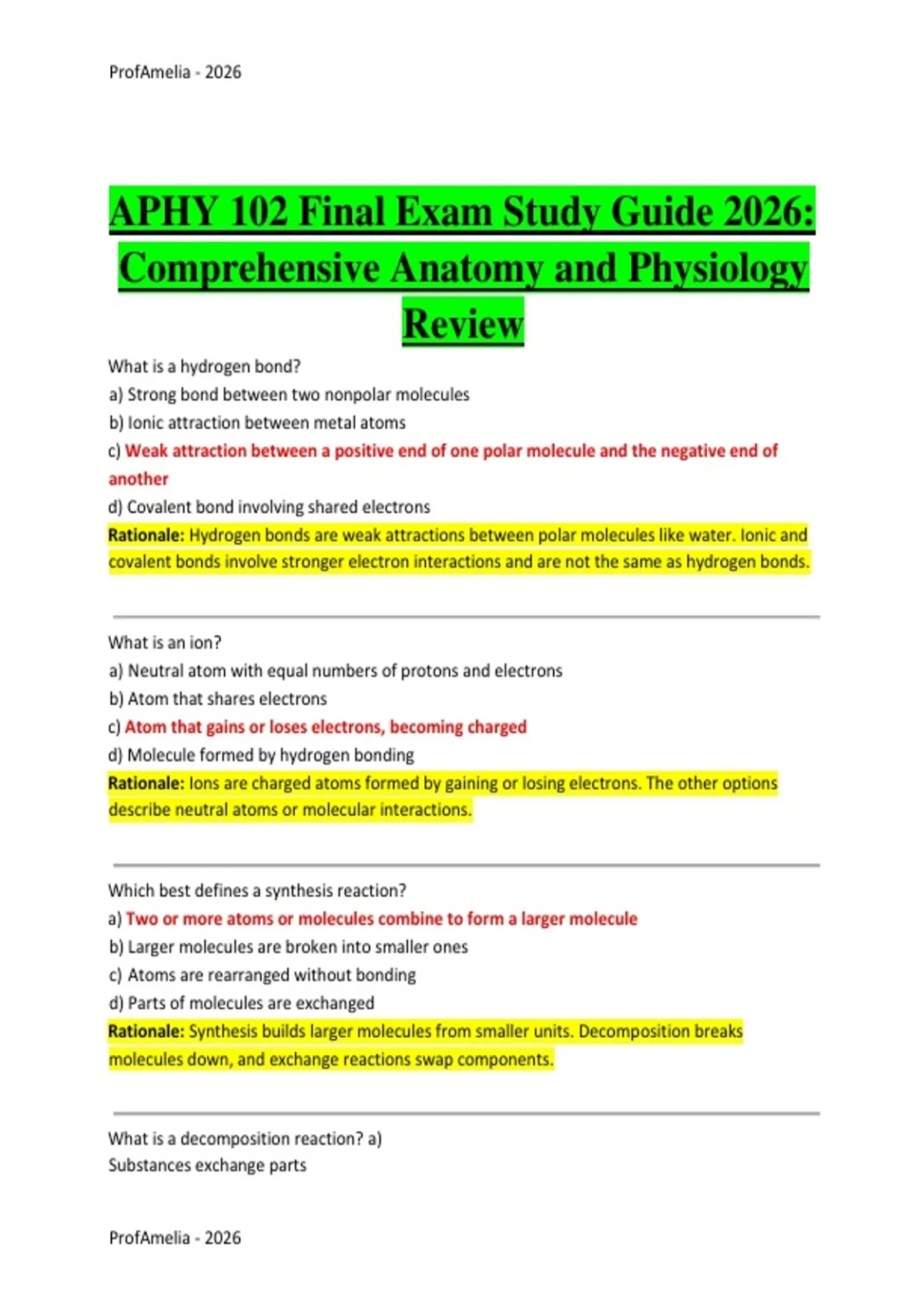 What is a hydrogen bond? a) Strong bond between two nonpolar molecules b) Ionic attraction between metal atoms c) Weak attraction between a positive end of one polar molecule and the negative end of another d) Covalent bond involving shared electrons Rationale: Hydrogen bonds are weak attractions between polar molecules like water. Ionic and covalent bonds involve stronger electron interactions and are not the same as hydrogen bonds. What is an ion? a) Neutral atom with equal numbers of protons and electrons b) Atom that shares electrons c) Atom that gains or loses electrons, becoming charged d) Molecule formed by hydrogen bonding Rationale: Ions are charged atoms formed by gaining or losing electrons. The other options describe neutral atoms or molecular interactions. Which best defines a synthesis reaction? a) Two or more atoms or molecules combine to form a larger molecule b) Larger molecules are broken into smaller ones c) Atoms are rearranged without bonding d) Parts of molecules are exchanged Rationale: Synthesis builds larger molecules from smaller units. Decomposition breaks molecules down, and exchange reactions swap components. What is a decomposition reaction? a) Substances exchange parts b) Large molecules break down into smaller molecules c) Two small molecules join together d) Reaction that absorbs water Rationale: Decomposition reactions break complex substances into simpler ones. Synthesis is the reverse, and exchange reactions involve swapping parts. What occurs in an exchange reaction? a) Molecules split into atoms b) Parts of molecules trade places c) Molecules combine to form water d) Acids react with metals Rationale: Exchange reactions involve replacing components between molecules. It is neither purely synthesis nor decomposition. What is an acid? a) Substance that absorbs hydrogen ions b) Electrolyte that releases hydrogen ions (H⁺) in water c) Molecule that releases hydroxide ions d) Substance that cannot ionize in water Rationale: Acids dissociate to release hydrogen ions. Bases remove H⁺ or release OH⁻, and nonelectrolytes do not ionize. What happens to a cell placed in a hypotonic solution? a) Water moves into the cell, causing it to swell or burst b) Water moves out of the cell, causing it to shrink c) No net movement of water occurs d) Solutes move into the cell causing plasmolysis Rationale: In a hypotonic environment, water enters the cell, leading to swelling. Hypertonic solutions cause shrinking, while isotonic solutions show no net movement. What is an isotonic solution? a) Solution with more solute than the cell b) Solution with no water molecules c) Solution with the same solute concentration as the cell, causing no net water movement d) Solution that causes cell lysis Rationale: Isotonic solutions maintain equilibrium with no net movement of water. Hypertonic and hypotonic solutions disrupt this balance. Where does glycolysis occur in a cell? a) Mitochondrial matrix b) Inner mitochondrial membrane c) Cytosol (cytoplasm) d) Nucleus Rationale: Glycolysis occurs in the cytosol. The Krebs cycle occurs in the mitochondrial matrix and the ETC in the inner mitochondrial membrane. What is the main purpose of NADH produced during glycolysis and the citric acid cycle? a) To directly produce ATP b) To break down glucose c) To carry high-energy electrons to the electron transport chain d) To store oxygen in cells Rationale: NADH transports electrons to the electron transport chain to generate ATP. It does not directly make ATP or store oxygen. What is the role of oxygen in aerobic respiration? a) Breaks glucose into pyruvate b) Acts as the final electron acceptor in the electron transport chain c) Produces glucose from water d) Converts ATP to ADP Rationale: Oxygen accepts electrons at the end of the electron transport chain, forming water. Without oxygen, the chain stops and ATP production drops. During which phase of the cell cycle does DNA replication occur? a) Prophase b) Cytokinesis c) Interphase (S phase) d) Telophase Rationale: DNA replication occurs during the S phase of interphase. Prophase and telophase are mitotic phases. What happens during metaphase of mitosis? a) Chromosomes condense and become visible b) Chromatids separate and move to opposite poles c) Chromosomes line up at the cell’s equatorial plate d) Nuclear membrane reforms Rationale: Metaphase is characterized by chromosomes aligning in the middle of the cell. Separation occurs during anaphase. What is cytokinesis? a) Division of the nucleus b) DNA replication c) Division of the cytoplasm to form two daughter cells d) Chromosomes becoming visible Rationale: Cytokinesis is the final stage of cell division, splitting the cytoplasm. Nuclear division occurs during mitosis. Which statement best describes enzymes? a) They are consumed in chemical reactions b) They work at any temperature and pH c) They are biological catalysts that speed up reactions without being used up d) They provide energy for cellular processes Rationale: Enzymes accelerate reactions and are not consumed. They function best at specific temperature and pH levels. What happens to enzymes at very high temperatures? a) Their activity increases infinitely b) They denature and lose their shape and function c) They produce more substrates d) They become more efficient Rationale: High temperatures disrupt enzyme structure, causing denaturation. This inactivates the enzyme rather than increasing efficiency. What is a base? a) Releases hydrogen ions in water b) Non-electrolyte c) Releases ions that combine with hydrogen ions (H⁺) d) Produces carbon dioxide Rationale: Bases accept hydrogen ions or release ions (like OH⁻) that neutralize acids. What is a salt? a) Only formed by metals b) Product of acid and base reacting to form water and electrolytes c) Non-electrolyte with no ions d) Gas released during reactions Rationale: Salts form from acid-base neutralization. They dissociate into electrolytes in water. What is the 