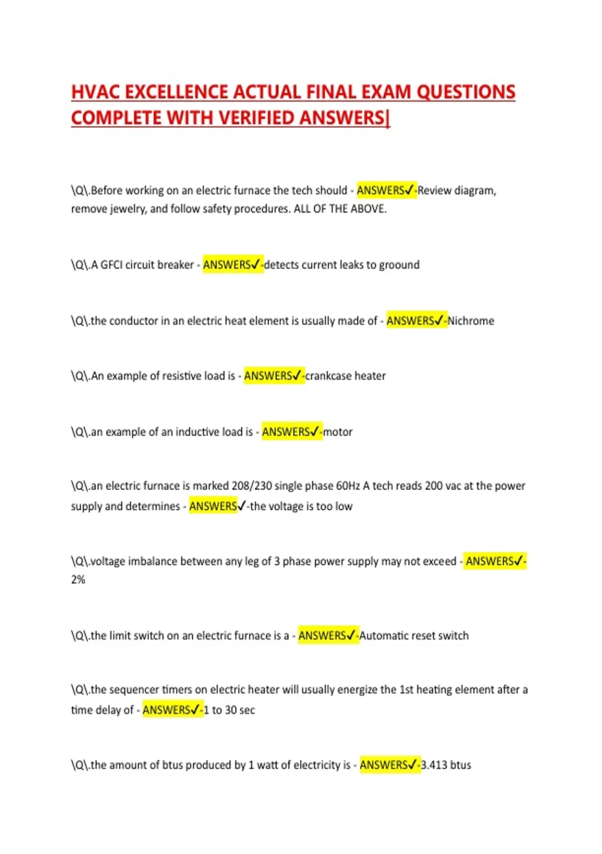 HVAC EXCELLENCE ACTUAL FINAL EXAM QUESTIONS COMPLETE WITH VERIFIED ANSWERS| Q.Before working on an electric furnace the tech should - ANSWERS-Review diagram, remove jewelry, and follow safety procedures. ALL OF THE ABOVE. Q.A GFCI circuit breaker - ANSWERS-detects current leaks to groound Q.the conductor in an electric heat element is usually made of - ANSWERS-Nichrome Q.An example of resistive load is - ANSWERS-crankcase heater Q.an example of an inductive load is - ANSWERS-motor Q.an electric furnace is marked 208/230 single phase 60Hz A tech reads 200 vac at the power supply and determines - ANSWERS-the voltage is too low Q.voltage imbalance between any leg of 3 phase power supply may not exceed - ANSWERS-2% Q.the limit switch on an electric furnace is a - ANSWERS-Automatic reset switch Q.the sequencer timers on electric heater will usually energize the 1st heating element after a time delay of - ANSWERS-1 to 30 sec Q.the amount of btus produced by 1 watt of electricity is - ANSWERS-3.413 btus Q.a tech reads 60 amps with a clamp on amp meter on a forced air furnace. the supply voltage is 230 volts AC, approx how many watts is the furnace using - ANSWERS-13,800 Q.a furnace is using 15,500 watts approx Kw - ANSWERS-15.5 Kw Q.a sequencer timer use _____ to close the contact points to the heater element - ANSWERS-heated snap-discs or bi-metal strips Q.an electric furnace heating thermostat must - ANSWERS-open on rise close on drop Q.a standard thermostat heat anticipator is ____ and wired in ____ with the heating control - ANSWERS-adjustable/series Q.some thermostat manufacturers require a jumper connection on the thermostat subbase of heating and cooling thermostat in order to - ANSWERS-use a single transformer Q.most electric heat elements use the following safties to prevent overheating - ANSWERS-snap disc and fusible link Q.a tech reads 70 amps to the single phase heater . the supply voltage is 230 volts Ac. Approx how many btus is the furnace producing - ANSWERS-54,949 Q.the control that prevents duct heater from operating unless there is adequate supply air is - ANSWERS-fan interlock Q.the COP for electric resistance heat is - ANSWERS-1 to 1 Q.what is the maximum kW element used on each contact of a residential heat sequencer - ANSWERS-5 kW Q.electric heaters are generally rated at ____ volts ac for kW output - ANSWERS-240 Q.the first stage of a sequencer usually has a set of contacts to - ANSWERS-start the blower fan motor Q.an automatic reset safety on a heater element generally opens at ____*F - ANSWERS-130-190*F Q.most heating elements are mounted on which type of insulator - ANSWERS-mica or ceramic Q.a 10 kW electric heater operating at 240 v draws 42 amps, what will a 10 kW heater wired to 480 volts draw - ANSWERS-21 amps Q.the purpose of a sequencer is to - ANSWERS-avoid a sudden power load Q.two major factors in determining the temp rise of an electric furnace are - ANSWERS-furnace KW and CFM Q.a major cause of electrical heat element burn out - ANSWERS-low airflow Q.a tech is checking the resistance on delta wired 3 phase 240 v 15 kW electic duct heater if one element is open he would read - ANSWERS-L1 to L2 22Ohm L1 to L3 22ohm L2 to L3 infinity