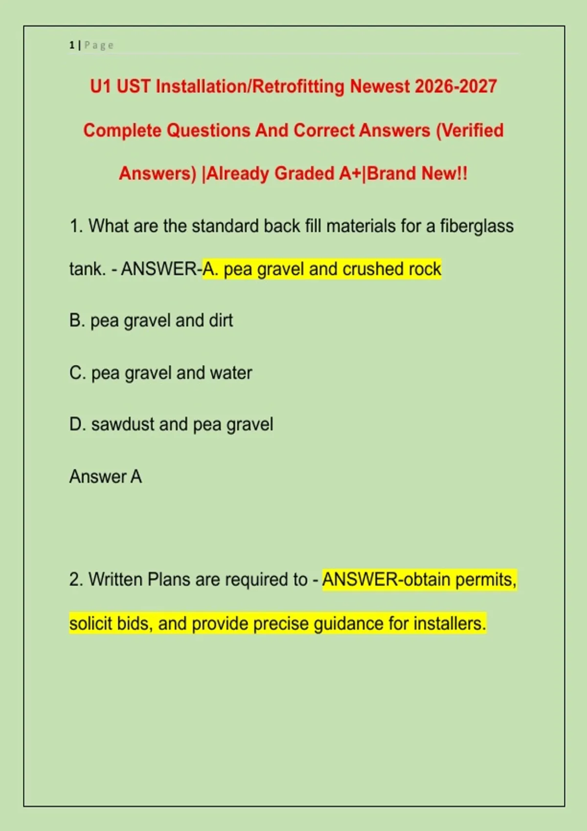 U1 UST Installation/Retrofitting Newest Complete Questions And Correct Answers (Verified Answers) |Already Graded A+|Brand New!!