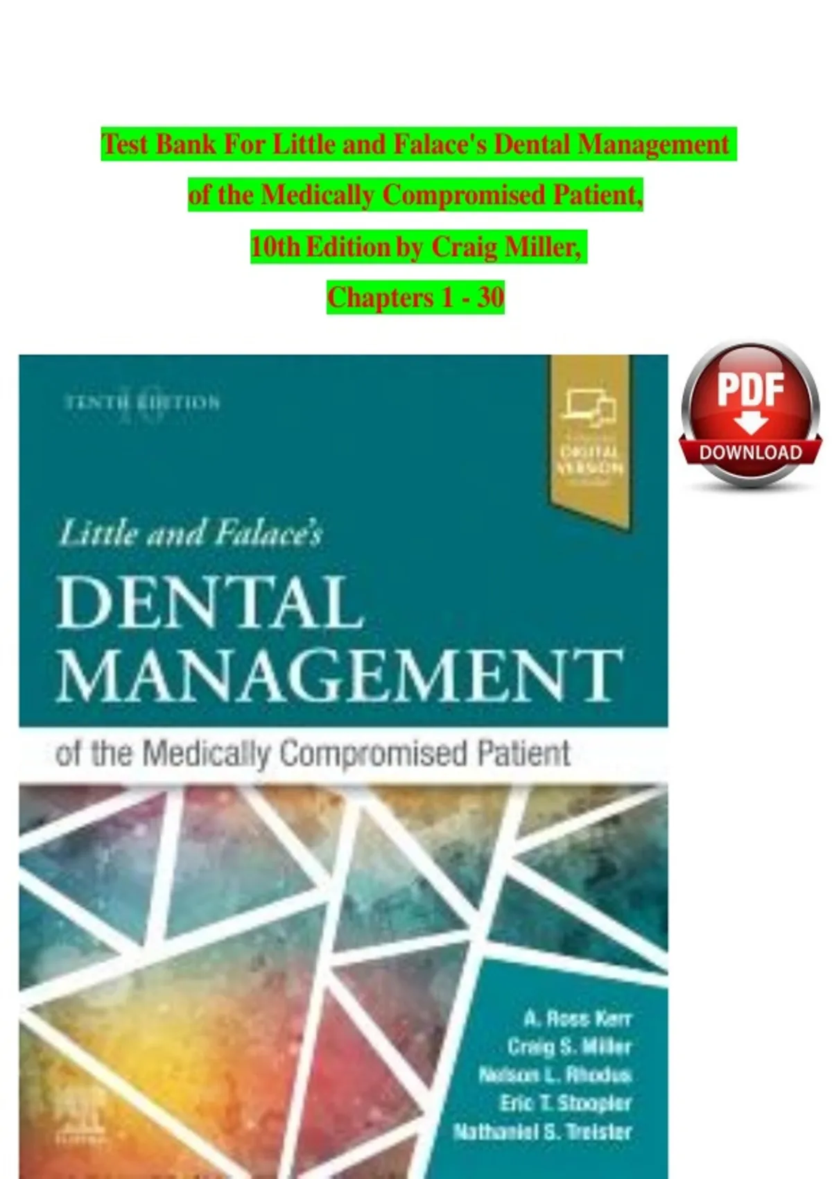 Prepare confidently for dentistry exams and clinical assessments with this comprehensive Test Bank for Little and Falace’s Dental Management of the Medically Compromised Patient, 10th Edition — fully updated for 2026! Designed for dental students, hygiene students, and clinicians, this test bank provides a wide range of practice questions paired with 100% accurate answers, aligned with the textbook content and exam expectations. Covering essential dental and medical management strategies, this resource reinforces clinical decision-making, patient evaluation, risk assessment, and evidence-based care for medically complex patients. Whether you’re studying systemic conditions, pharmacologic considerations, or dental treatment modifications, this test bank helps you reinforce key concepts and excel on quizzes, exams, and clinical evaluations. Authors: Craig Miller, DMD, MS (Author) Nelson L. Rhodus, DMD, MPH