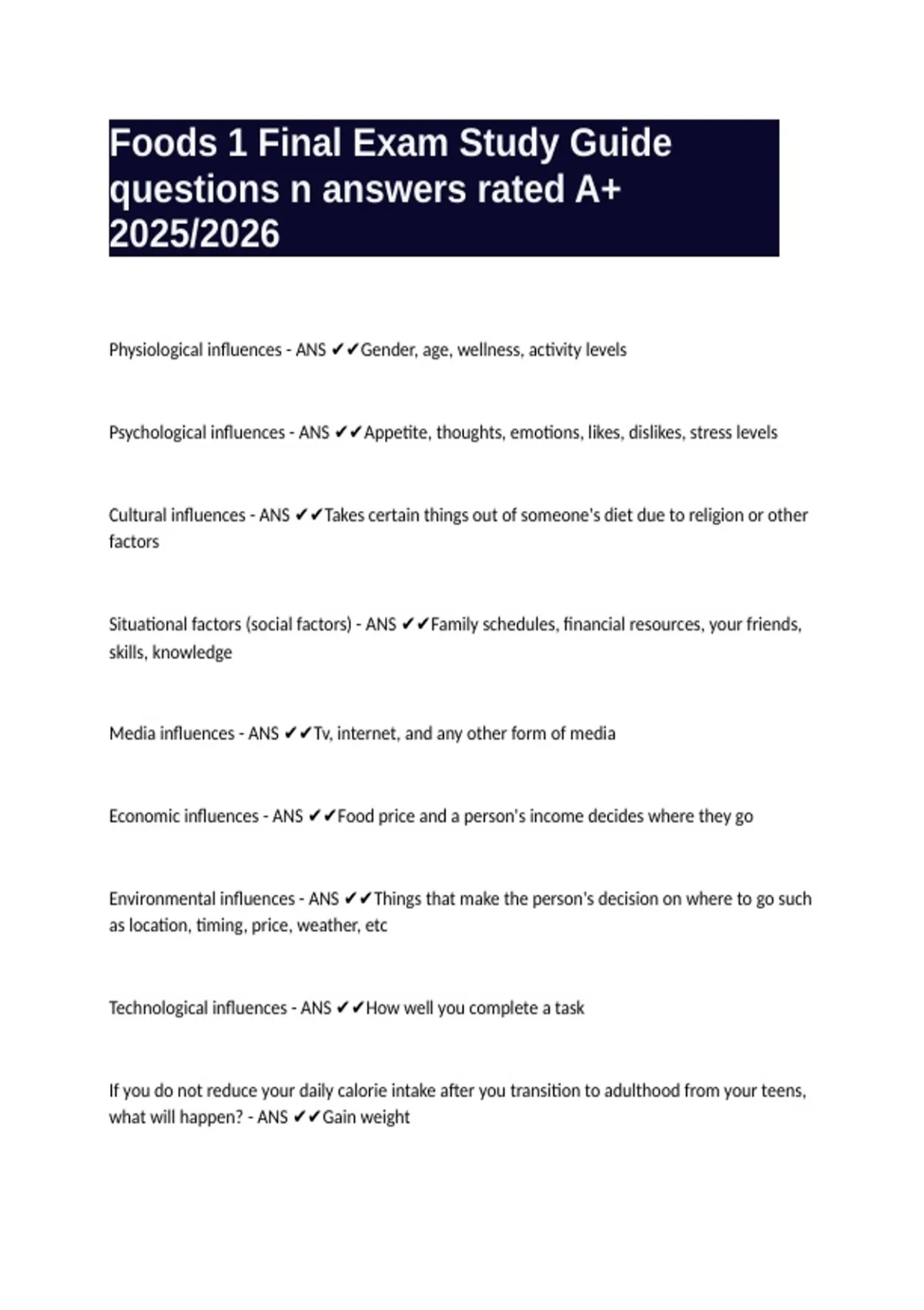Psychological influences - ANS ✔✔Appetite, thoughts, emotions, likes, dislikes, stress levels