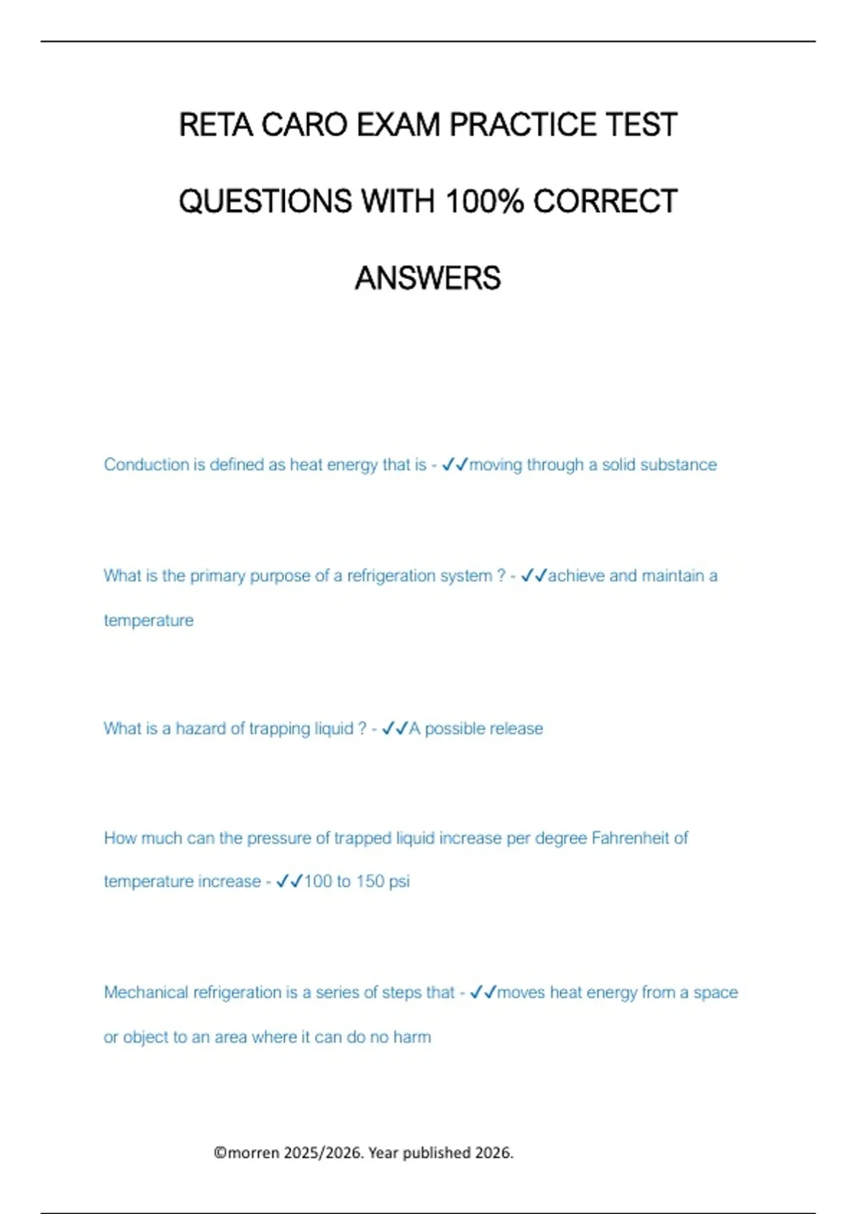 RETA CARO EXAM PRACTICE TEST QUESTIONS WITH 100% CORRECT ANSWERS Conduction is defined as heat energy that is - moving through a solid substance What is the primary purpose of a refrigeration system ? - achieve and maintain a temperature What is a hazard of trapping liquid ? - A possible release How much can the pressure of trapped liquid increase per degree Fahrenheit of temperature increase - 100 to 150 psi Mechanical refrigeration is a series of steps that - moves heat energy from a space or object to an area where it can do no harm ©morren 2025/2026. Year published 2026. How does the refrigeration compressor maintain the temperature in the system evaporators ? - Drawing out vaporized refrigerant at a rate to maintain the desired evaporating pressure Which natural refrigerant is considered to be non- flammable - Carbon Dioxide Heat energy always flows - from an object at a higher temperature to an object at a lower temperature 32 psia equals - 17.3 psig 0 ° F is equal to - -18 ° C Why does the refrigerant in the condenser change state from vapor to liquid - The refrigerant loses heat energy to the surrounding environment If a liquid is below its saturation temperature what is its condition ? - Subcooled ©morren 2025/2026. Year published 2026.