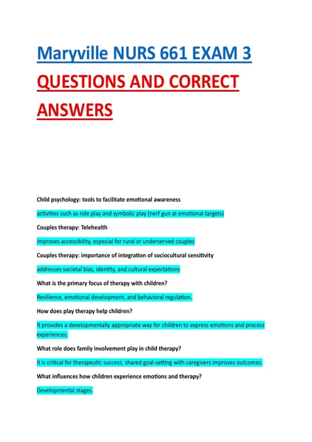 Maryville NURS 661 EXAM 3 QUESTIONS AND CORRECT ANSWERS Child psychology: tools to facilitate emotional awareness activities such as role play and symbolic play (nerf gun at emotional targets) Couples therapy: Telehealth improves accessibility, especial for rural or underserved couples Couples therapy: importance of integration of sociocultural sensitivity addresses societal bias, identity, and cultural expectations What is the primary focus of therapy with children? Resilience, emotional development, and behavioral regulation. How does play therapy help children? It provides a developmentally appropriate way for children to express emotions and process experiences. What role does family involvement play in child therapy? It is critical for therapeutic success; shared goal-setting with caregivers improves outcomes. What influences how children experience emotions and therapy? Developmental stages. What is a key aspect of setting boundaries in child therapy sessions? To support emotional learning and safety. What was the focus of early (historical) couples counseling? Practical advice and psychoeducation, often working individually with each partner. What shift occurred in couples therapy during the 1960s and 70s? A focus on relational dynamics and feedback loops within conjoint sessions. What modern approaches are incorporated in couples therapy? Integrative and evidence-based approaches tailored to specific relational issues. How has couples therapy expanded in recent years? To address diverse populations, including LGBTQ+ relationships and polyamorous dynamics. Couples therapy: What is Emotionally Focused Therapy (EFT) centered on? Attachment bonds and emotional reengagement. What does cognitive-behavioral couples therapy target? Maladaptive communication patterns and behavior modification. What is the goal of behavioral approaches in couples therapy? To increase positive interactions and decrease negative exchanges. What do genograms map in family therapy? Family structures and histories using standardized symbols. example: dashed lines for adoption, slashes for death/divorce What patterns can genograms help identify? Multigenerational transmission of trauma or substance use. What common relational dysfunctions are addressed in therapy? Poor communication, emotional disconnection, and loss of trust due to infidelity. How can therapy improve physical health outcomes? By reducing relational stress, which can lead to issues like migraines and insomnia. What is the focus of structural family therapy?