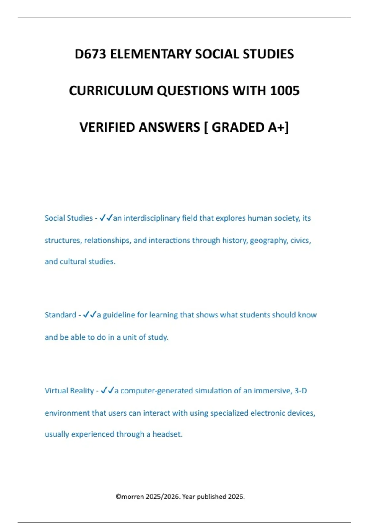 D673 ELEMENTARY SOCIAL STUDIES CURRICULUM QUESTIONS WITH 1005 VERIFIED ANSWERS [ GRADED A+] Social Studies - an interdisciplinary field that explores human society, its structures, relationships, and interactions through history, geography, civics, and cultural studies. Standard - a guideline for learning that shows what students should know and be able to do in a unit of study. Virtual Reality - a computer-generated simulation of an immersive, 3-D environment that users can interact with using specialized electronic devices, usually experienced through a headset. ©morren 2025/2026. Year published 2026. Augmented Reality - Overlays digital information onto real-world environment, enhancing the user's perception of reality through devices such as smartphones or smart glasses. Artificial Intelligence - The simulation of human intelligence processes by computer systems, including learning, reasoning, and problem solving. SAMR Model - Substitution, Augmentation, Modification, & Redefinition. Developed by Dr. Ruben Puentedura, it represents different levels of technology integration in education. Substitution - Technology as a direct substitute for a traditional task without significant changes. Augmentation - Technology as task enhancement by providing additional functionalities or improvements over traditional methods. ©morren 2025/2026. Year published 2026.