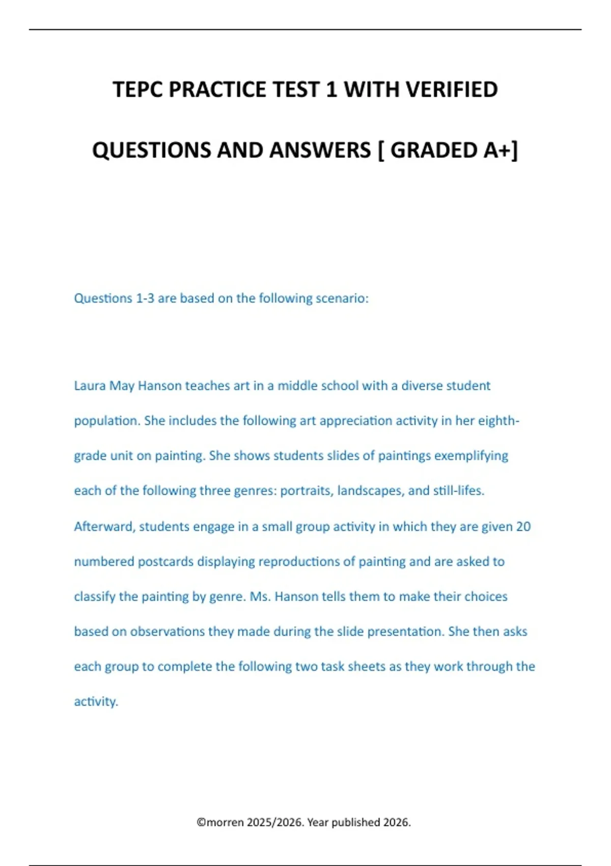 TEPC PRACTICE TEST 1 WITH VERIFIED QUESTIONS AND ANSWERS [ GRADED A+] Questions 1-3 are based on the following scenario: Laura May Hanson teaches art in a middle school with a diverse student population. She includes the following art appreciation activity in her eighth grade unit on painting. She shows students slides of paintings exemplifying each of the following three genres: portraits, landscapes, and still-lifes. Afterward, students engage in a small group activity in which they are given 20 numbered postcards displaying reproductions of painting and are asked to classify the painting by genre. Ms. Hanson tells them to make their choices based on observations they made during the slide presentation. She then asks each group to complete the following two task sheets as they work through the activity. ©morren 2025/2026. Year published 2026. Activity: Identify the genre of paintings TASK 1: Examine each of the reproductions in your set of 20 postcards, and classify each painting according to its genre. Use the Other c - Prefer constructing knowledge to receiving information passively In the sample sets given to each group, Ms. Hanson includes reproductions of paintings created in a wide range of time periods and cultural traditions, including cultures represented by students' own backgrounds. By doing this, Ms. Hanson best demonstrates an understanding of the importance of: -Taking advantage of the diversity within and beyond the classroom to create a classroom environment that respects and celebrates differences -Fostering students' view of learning as a purposeful pursuit that is meaningful to them -Taking into account students' individual strengths and learning styles in order to design instruction that maximizes learning for a diverse student population ©morren 2025/2026. Year published 2026.